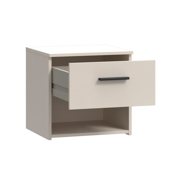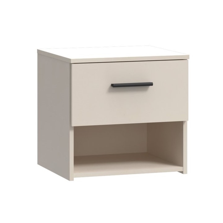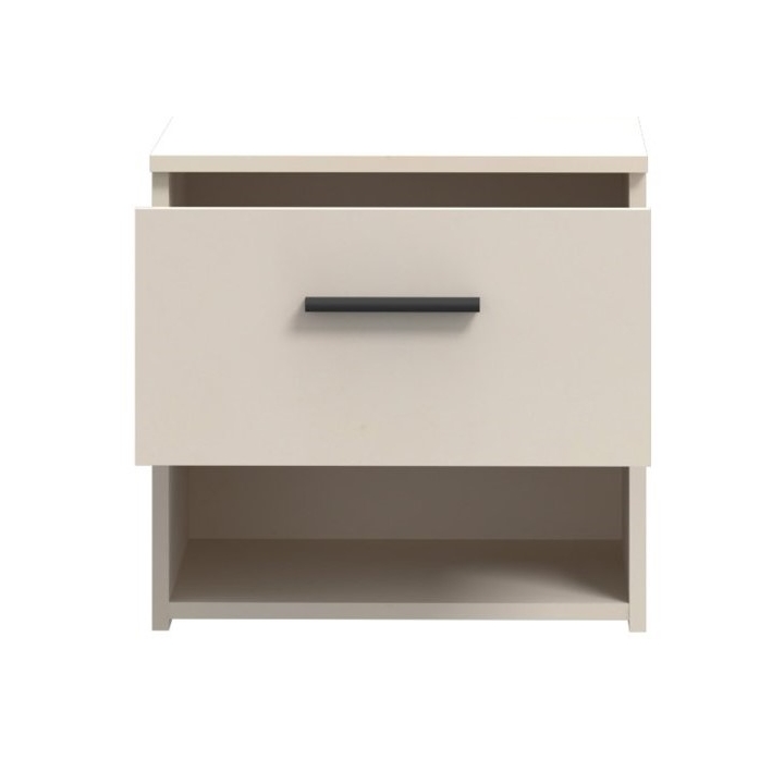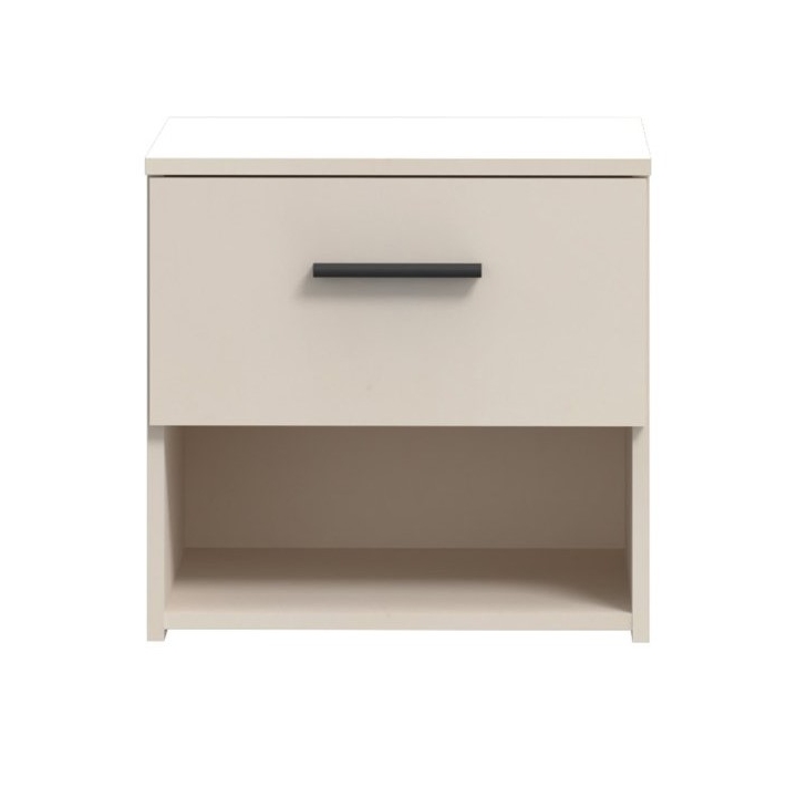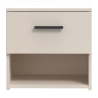 The Ingalill WKTK012-U60 bedside cabinet from Forte is a piece of furniture with a simple, modern look, maintained in a subtle shade of beige. The drawer front is distinguished by a black handle, which contrasts with the light colouring, giving the whole a distinctive accent. As a result, the cabinet will blend in with both light and darker bedroom arrangements.