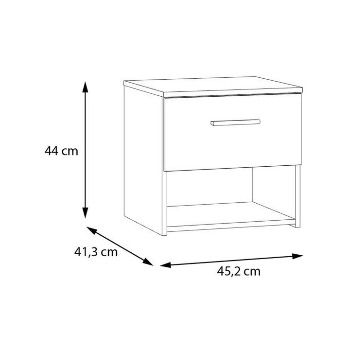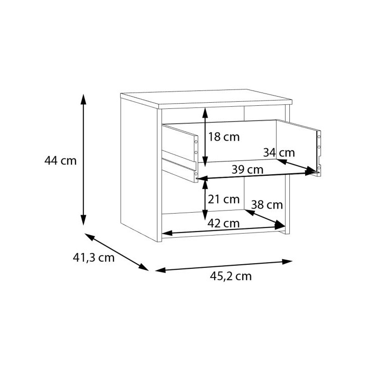 The piece of furniture measures 44 cm high, 45.2 cm wide and 41.3 cm deep. Both the fronts and sides are made of chipboard, which guarantees a consistent look and durability. Thanks to its compact design and small size, the cabinet even fits into smaller bedrooms.