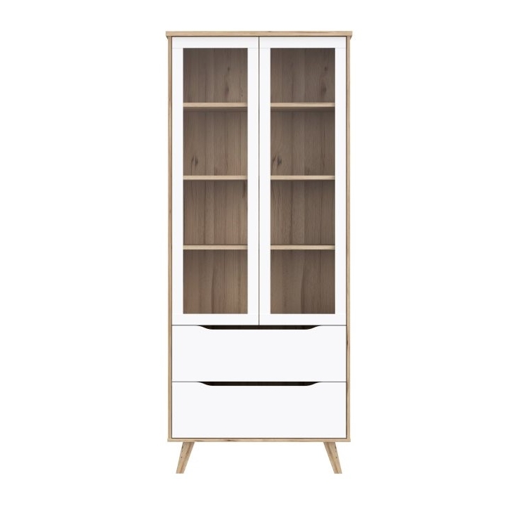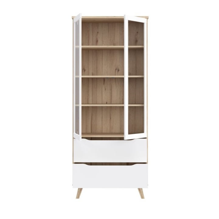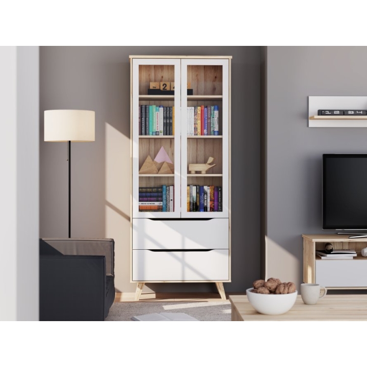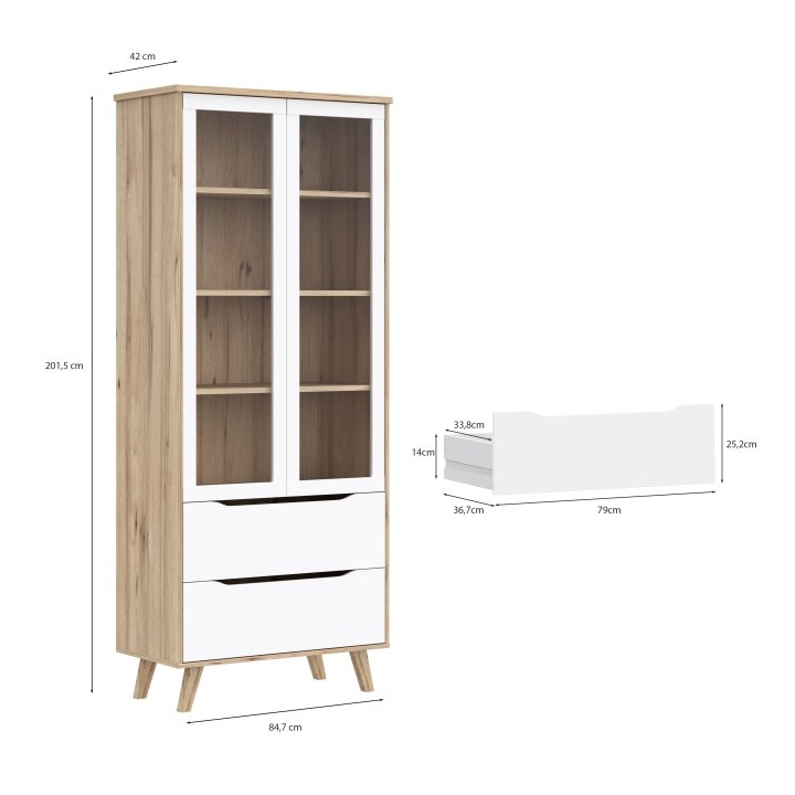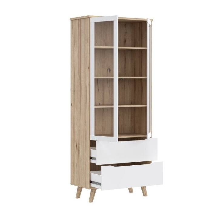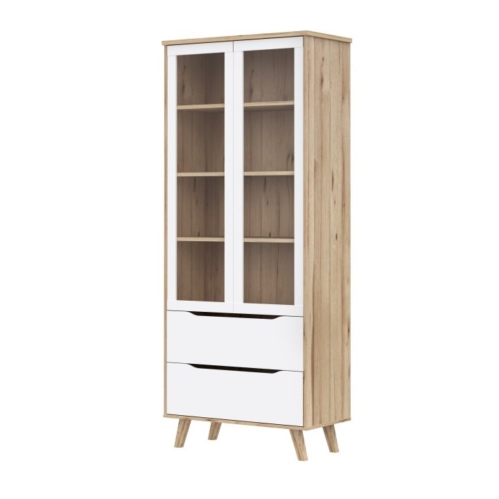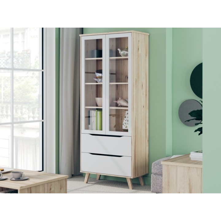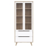 The VNKV722-L25 Vankka Forte showcase is a showcase with glass doors and two drawers that would work well in a living room, dining room or study. Made of particle board in oak board and white decors, it combines modern design with convenient storage. The tempered glass cabinet doors allow tableware, books or decorations to be displayed, while ball-bearing slides in the drawers ensure that they pull out smoothly.