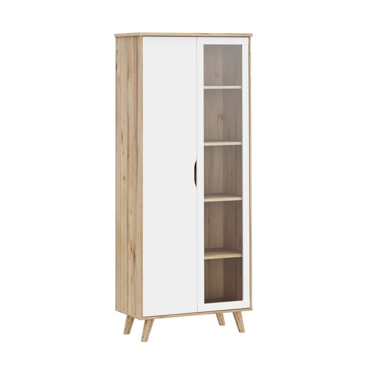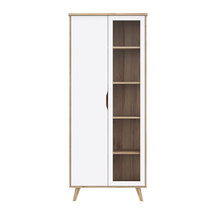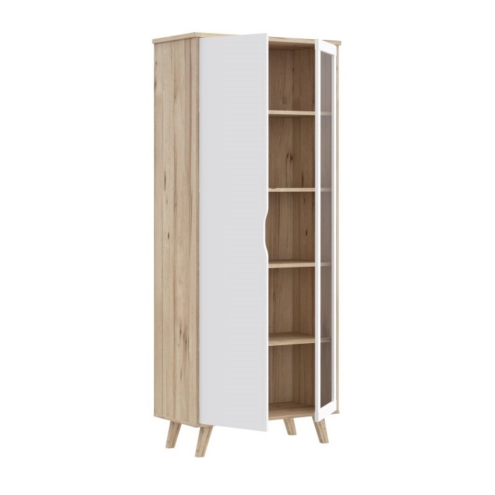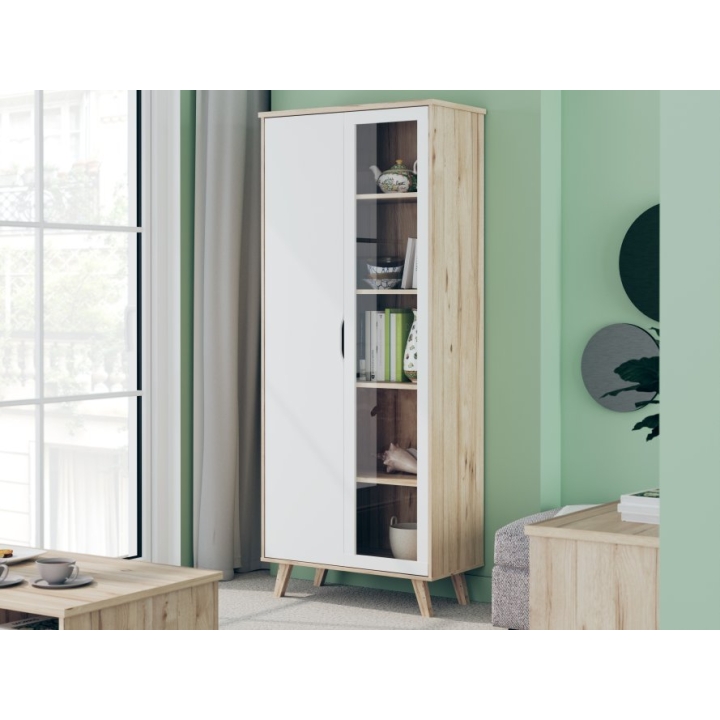 The VNKV721-L25 Vankka Forte showcase is a showcase with a glass door and two drawers that would work well in a living room, dining room or study. Made of chipboard in oak plank and white decors, it fits into many interior arrangements. The tempered glass cabinet doors allow you to display tableware, books or decorations, and the ball-bearing slides in the drawers ensure their smooth extension.