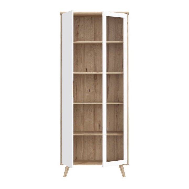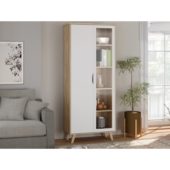 The vitrine with glass doors stands on wooden legs, which gives it a light appearance. The lack of handles emphasises the modern character of the furniture. A display cabinet for the living room or dining room is a combination of storage and display space.