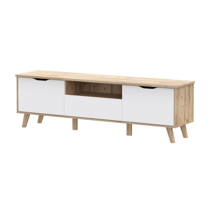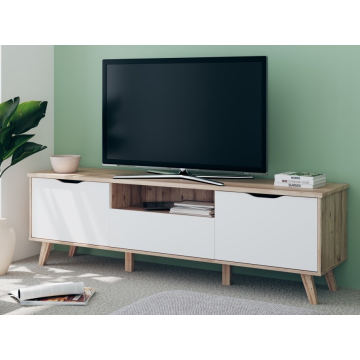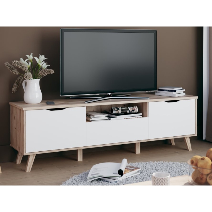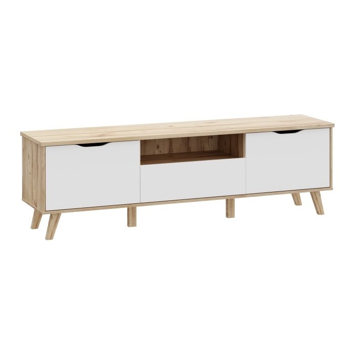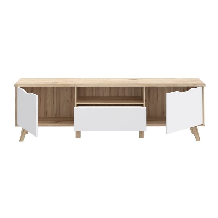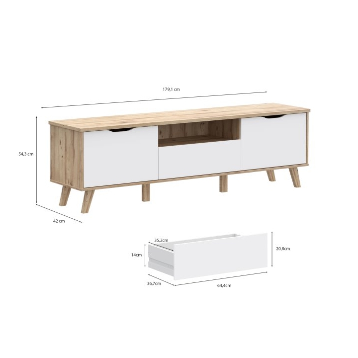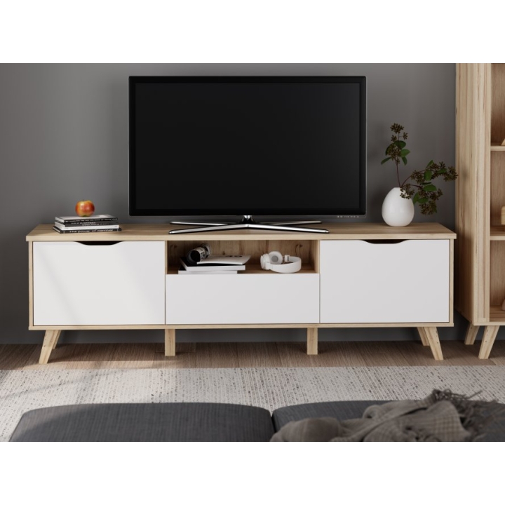 The RTV cabinet with cabinets and drawer will work well in a modern living room. The oak plank décor and white fronts emphasise the simple form of the furniture. High legs in the colour of wood add lightness to the structure. The cabinet requires assembly.
