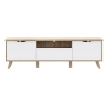 The Vankka RTV cabinet in oak plank with white fronts is an option for larger spaces. The furniture combines two closed cabinets, a drawer and an open shelf, allowing you to store RTV equipment, cables and accessories. The carcass is made of chipboard and ball bearing slides ensure smooth drawer extension.