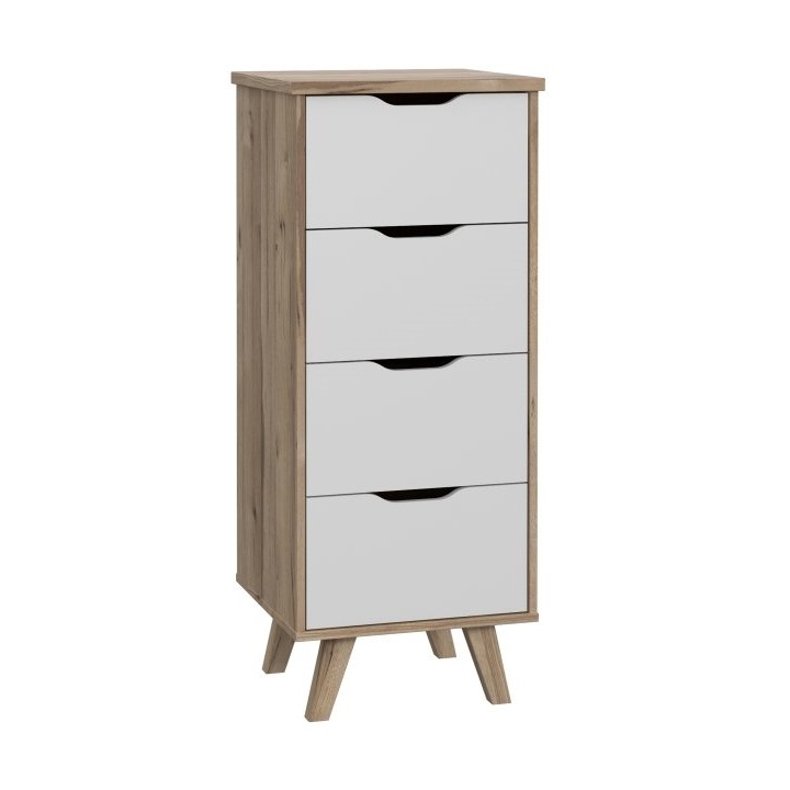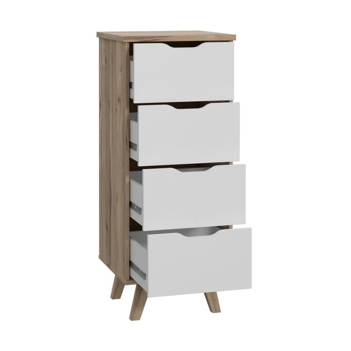 The VNKK311-L25 Vankka Forte chest ofdrawers, measuring 45 cm wide, 108.7 cm high and 42 cm deep, is a compact piece of storage furniture that will work well in a living room, bedroom, hallway or teenager's room. Its four capacious drawers will hold clothes, accessories or documents, helping to organise the space. The Oak Plank shade finish, combined with the white fronts, gives it a modern look that suits a variety of interior designs.