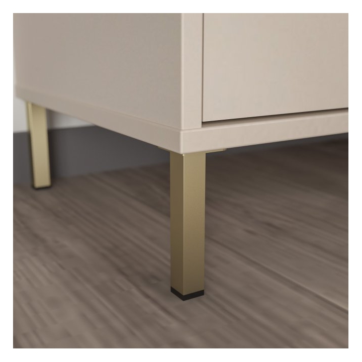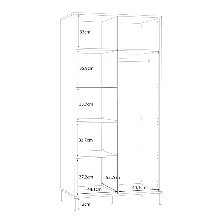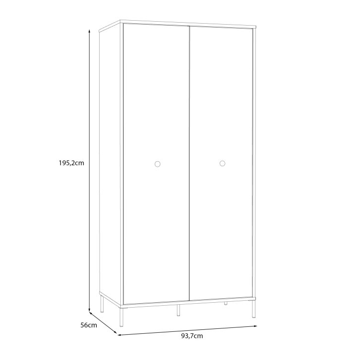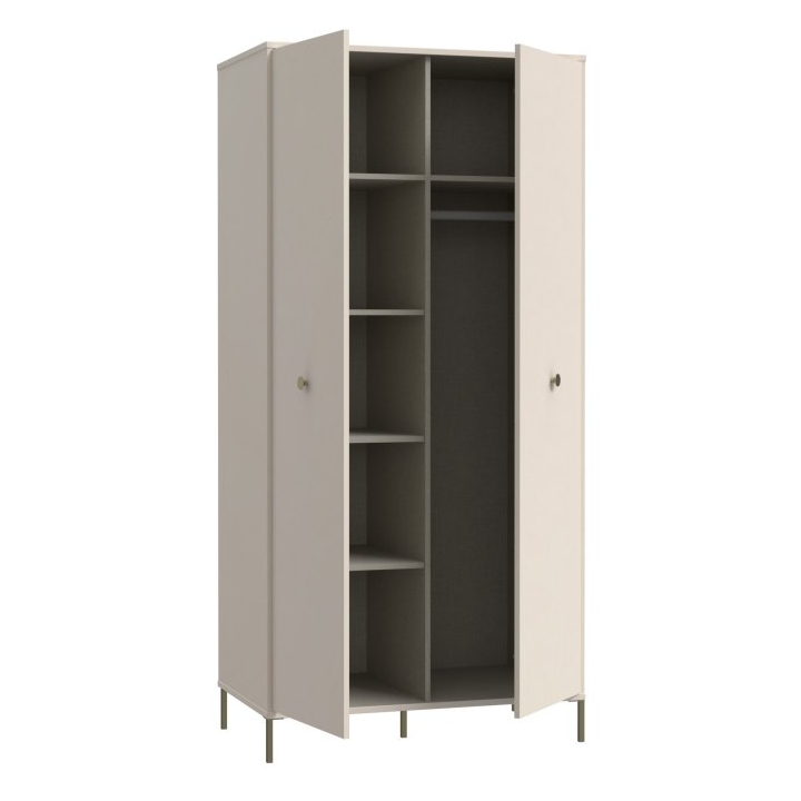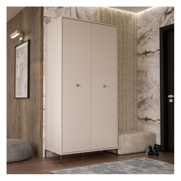 With a width of 93.7 cm, a height of 195.2 cm and a depth of 55.8 cm, the wardrobe is ideal for a bedroom, dressing room or hallway. The metal gold legs give the furniture a unique look and emphasise its modern style. Thanks to its mounting to the wall, the furniture is stable and safe for everyday use. The furniture needs to be assembled.