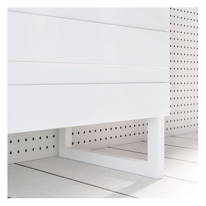 The fronts are made of durable PVC and the solid carcass is made of particle board, ensuring durability and resistance to damage. The edges are protected by ABS material, which strengthens the structure and protects it against abrasion. The chest of drawers sits on sturdy MDF legs, which add to its visual lightness while emphasising the meticulous finish of the entire unit.