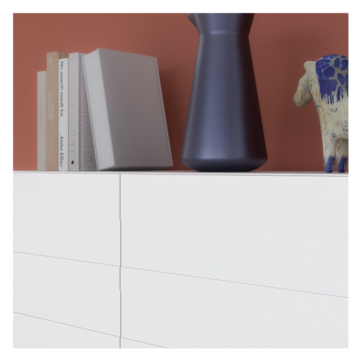 The push to open system eliminates the need for handles, which gives the chest of drawers a uniform and harmonious form. Edges protected by ABS edging protect the structure from mechanical damage. The ability to mount to the wall increases stability, and the included hardware makes installation easy.