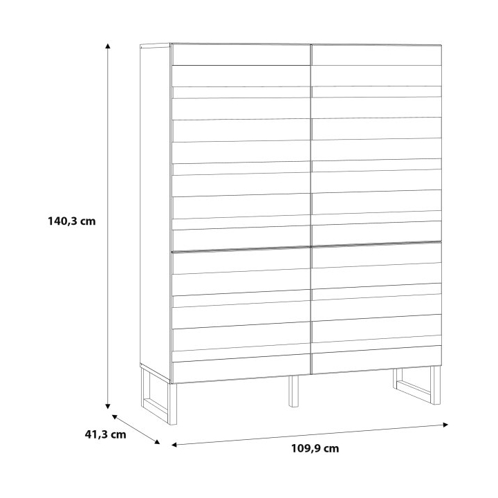 The furniture is 109.9 cm wide, 140.3 cm high and 41.3 cm deep. The carcass is made of chipboard, while the fronts are made of MDF with a PVC coating, which makes them more resistant to everyday use. The combination of these materials guarantees durability and ease of cleaning.
