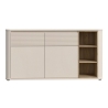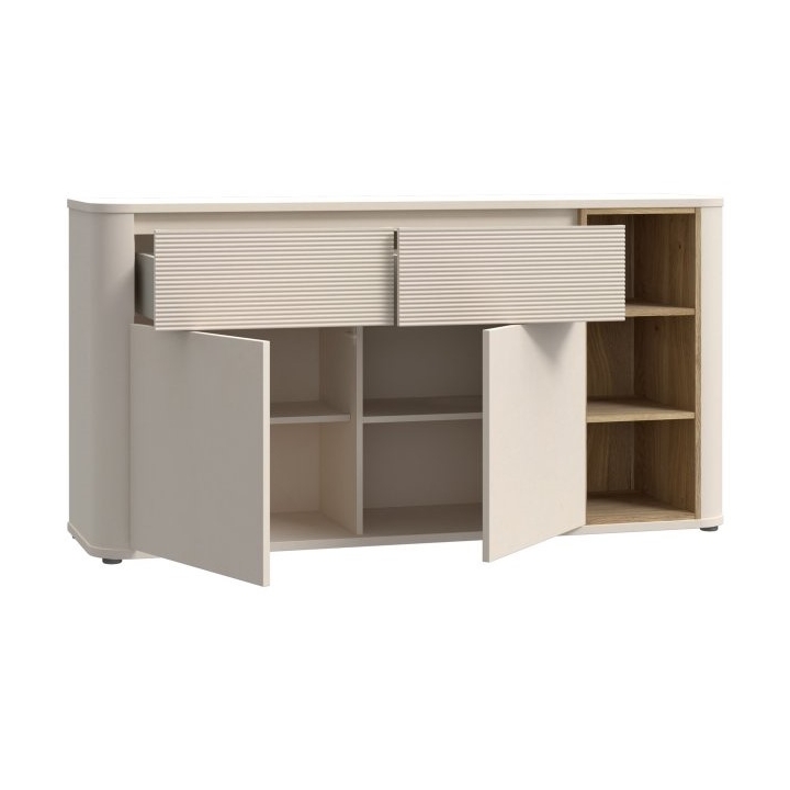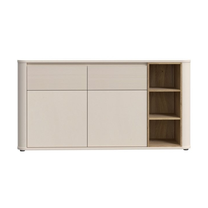 The furniture is available in several colour variants, which allows it to be matched to a variety of interiors. The chest of drawers in the decors Oak Mauvella, Oak Artisan, Oak Cabezone, in a bookcase insert and the body and fronts in the colours Black Oak, Terracotta and Sand gives you a wide choice and allows you to create a harmonious space in the living room, bedroom or dining room. With a width of 160 cm, a height of 83.1 cm and a depth of 41.3 cm, the chest of drawers provides ample storage space. The glide-type legs protect the floor from scratches and selected parts of the design have been protected with ABS edging. Made from chipboard and MDF, it guarantees durability and aesthetics.