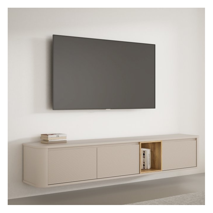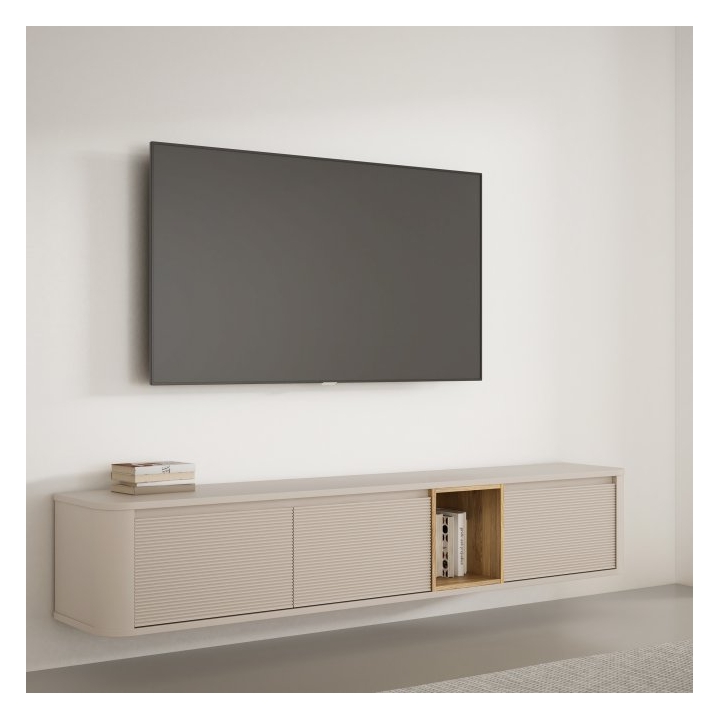 The furniture measures 215 cm wide, 41.3 cm high and 41.5 cm deep, and its top can support up to 40 kg, making it suitable for TVs up to 97 inches. A soft-close system provides comfort, and the wall-mounting option allows you to choose between a wall-mounted or standing version.