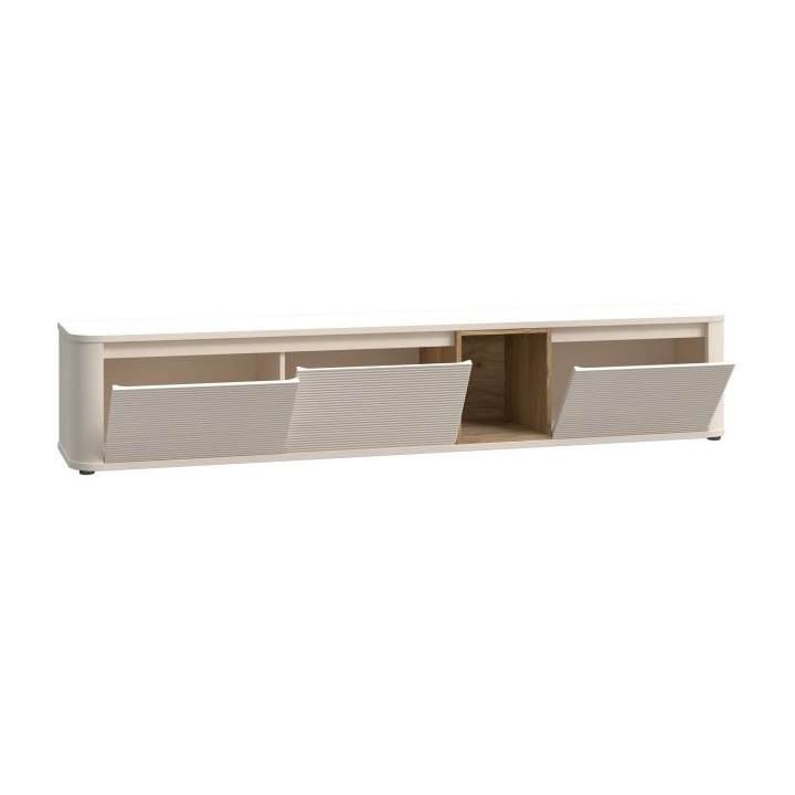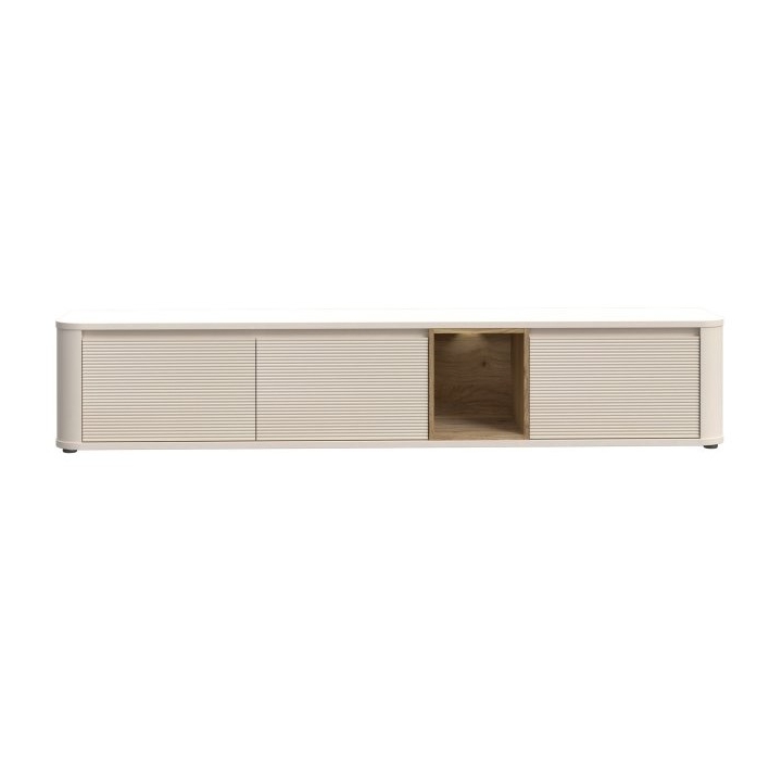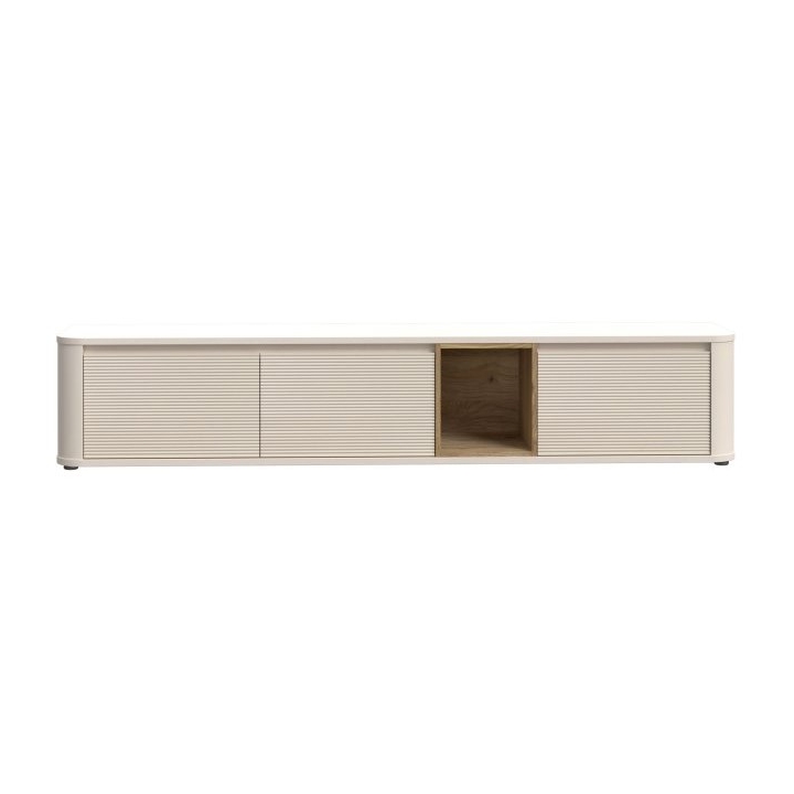 The P BTHTH141 BreathtakerRTV cabinet byForte is a piece of furniture suitable for modern interiors, combining minimalist design with comfort. The fluted fronts emphasise its character, while the rounded edges add lightness to the piece. The cabinet is available in various decors: Mauvella Oak / Sand, Cabezone Oak / Artisan Oak / Black Oak and Terracotta / Mauvella Oak , allowing you to match it to your interior style. It has three tilting cabinets and an open recess that can be illuminated with optional lighting.