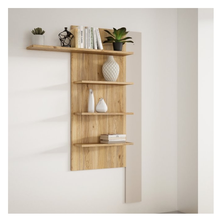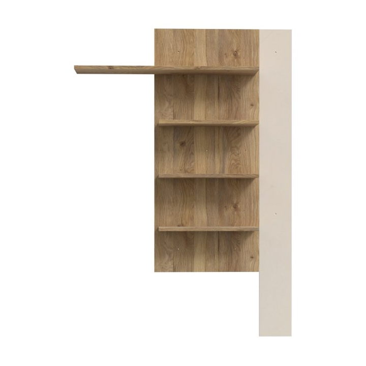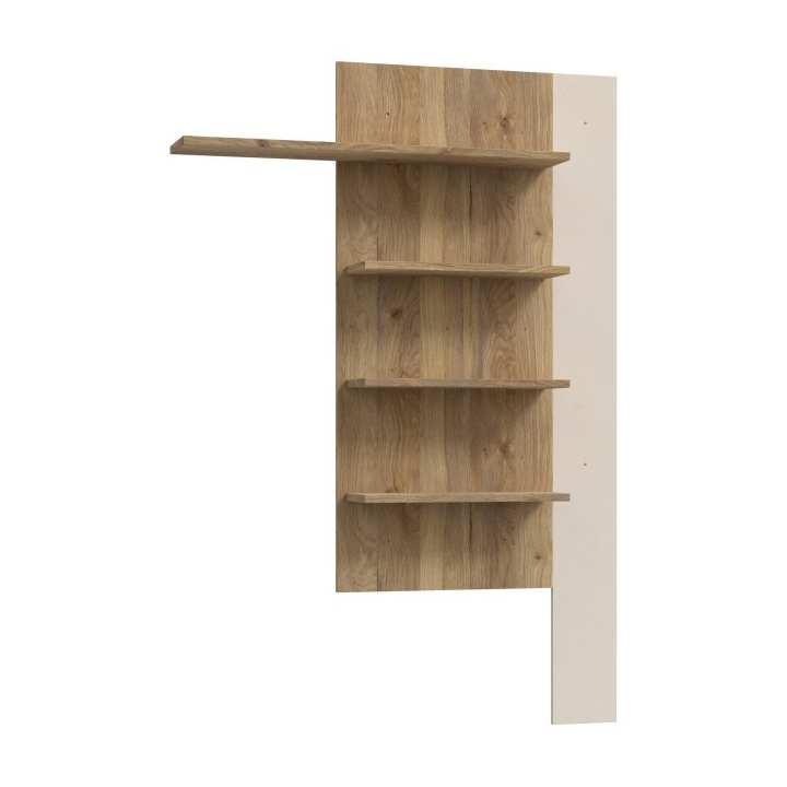 The BTHB01 Breathtaker ForteHanging Shelf is a modern piece of interior design that combines decorative with storage. It has four board shelves including a top longer shelf, creating a space ideal for books, decorations or other small items. The asymmetrical design in combination with decors in different variants such as Mauvella Oak / Sand, Cabezone Oak / Artisan Oak , Terracotta / Mauvella Oak allows the furniture to match different interior arrangements.