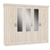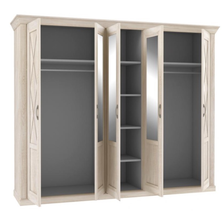 The wardrobe wardrobe from the Kashmir collection by the Forte manufacturer will provide you with plenty of space to store your clothes. The furniture was designed with Provencal interiors in mind. The carcass is made of furniture board in the beautiful colour of white pine. The fronts are made of MDF and decorated with beautiful symmetrical applications. The wardrobe is five-door, the three middle doors have been fitted with mirrors so that each user can easily assess their daily outfit. Behind the middle door you will find up to 5 spacious shelves, which will allow you to sort and keep your wardrobe tidy. On the right and left side of the furniture you will find hanger rods hidden behind the doors. An additional element worthy of attention and giving an extraordinary charm to the whole are the carefully made metal handles.