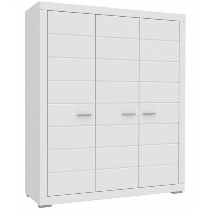 The white wardrobe from the Snow collection from the manufacturer Forte is a modern, geometric and capacious solid with a functional use, especially in bedrooms, alcoves and youth rooms, as well as other rooms where there is a need to organise a wardrobe. The white does not go out of the interior trends, and through the transverse minimalist milling of the fronts, the wardrobe gains a modern character. Set on low chrome legs, the wardrobe with shelves and a clothes rail is visually light and spacious.For the wardrobe, you can buy an internal chest of drawers to optimise the furniture according to your needs.The three-door Snow wardrobe from Forte allows you to store and arrange your clothes comfortably on six shelves and a wide clothes rail.