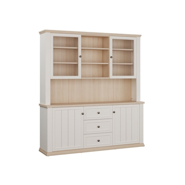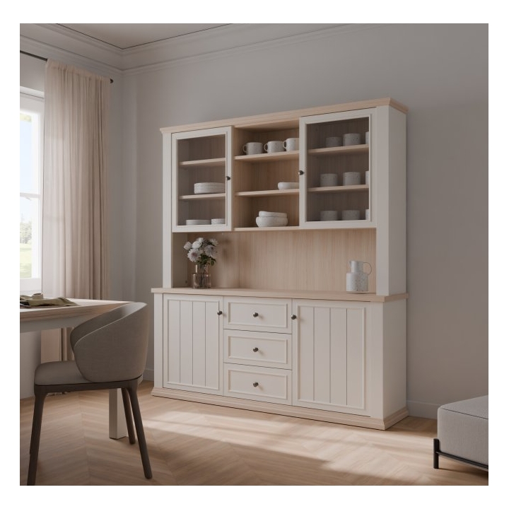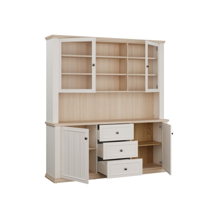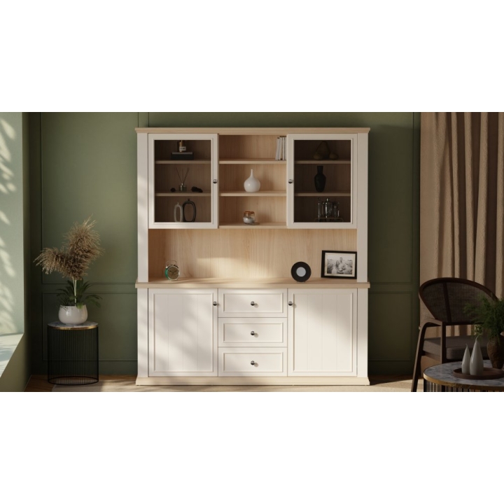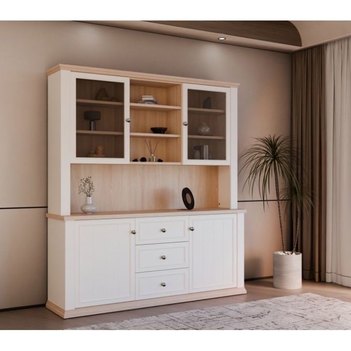 The cabinet offers a well-organised combination of storage and display space. The upper section consists of six shelves, with the side sections placed behind glass doors, making them ideal for displaying tableware or glassware. In the central part, there is an open niche with a wide surface that can be used to display decorative items. The lower section includes three spacious drawers (with a load capacity of up to 3 kg each) and two cupboards with internal shelves, suitable for storing heavier items.