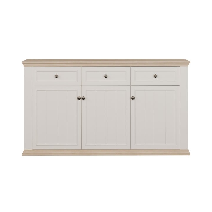 The Pontypool sideboard is a wide storage unit designed for use in the living room, dining room, or bedroom. It measures 169.2 cm in width, 95.4 cm in height, and 43.5 cm in depth. The structure is based on a durable chipboard carcass, while the fronts are made of MDF, ensuring strength and long-term stability.