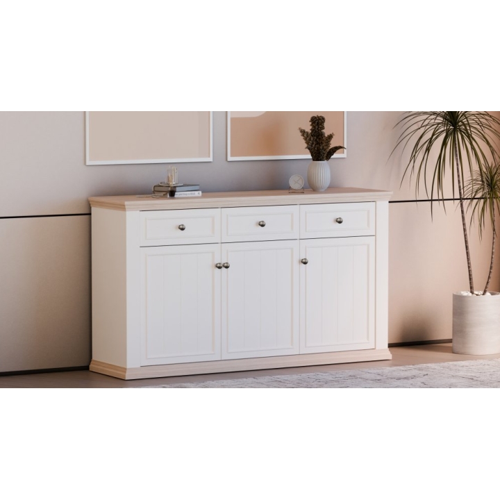 The interior layout has been carefully planned to make the most of the available space. Directly under the top are three spacious drawers, each with a load capacity of up to 5 kg. The central section features three cupboards with doors, each containing one internal shelf with a maximum load capacity of 15 kg. The wide top surface, with a load capacity of up to 40 kg, provides a stable base for decorations, framed photos, or tableware.