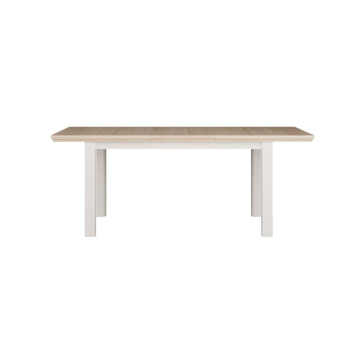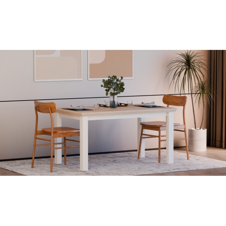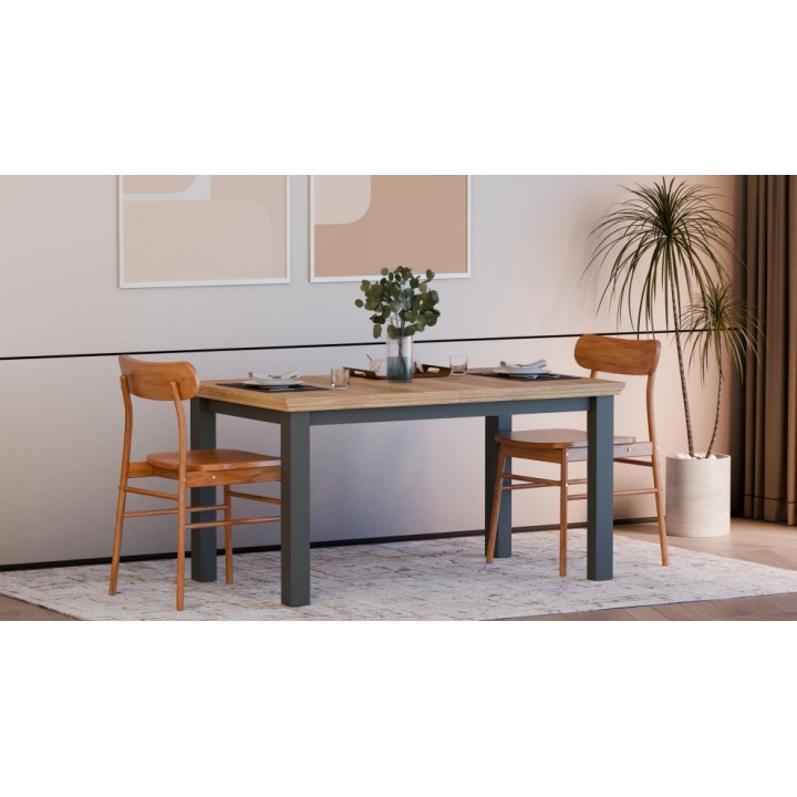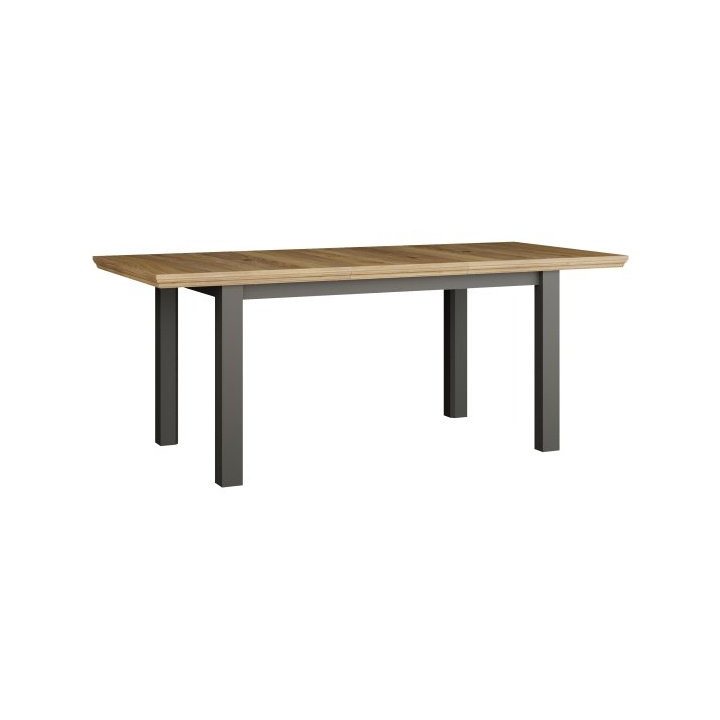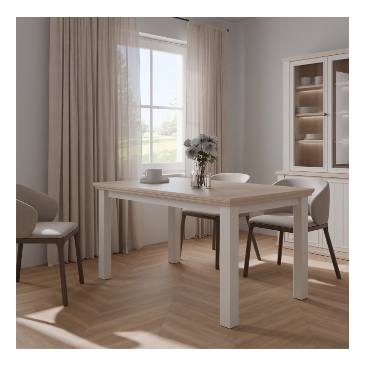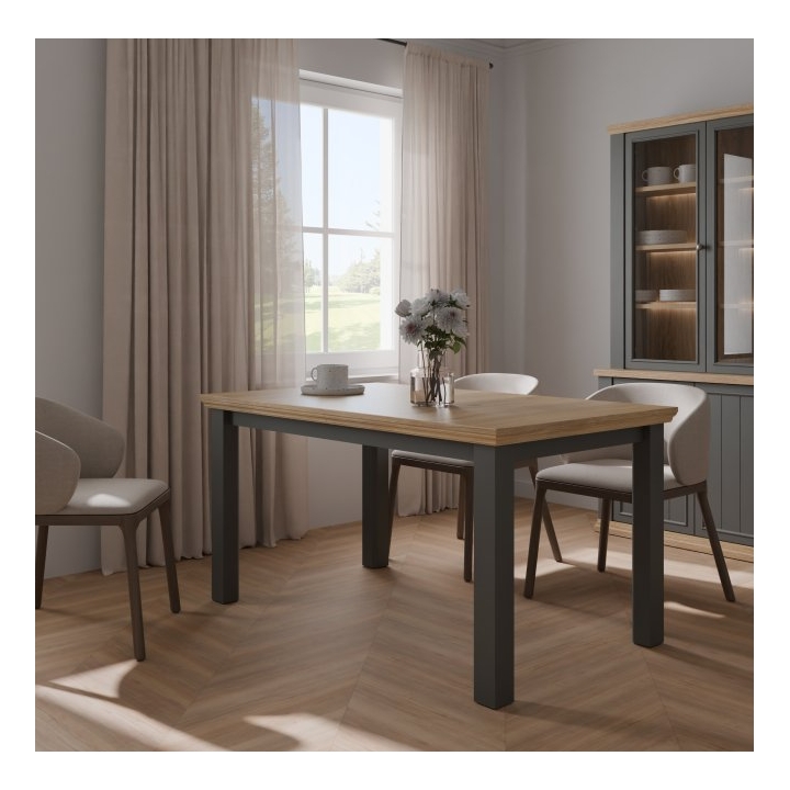 The table is equipped with an internal extension leaf, which is stored under the tabletop, allowing for quick and easy adjustment of the table size depending on current needs. The construction enables comfortable seating for up to 8 people when fully extended. The table is available in two color combinations: white with oak Riva accents or grey with oak Mauvella.