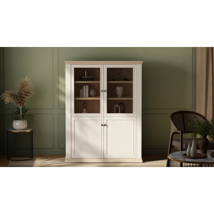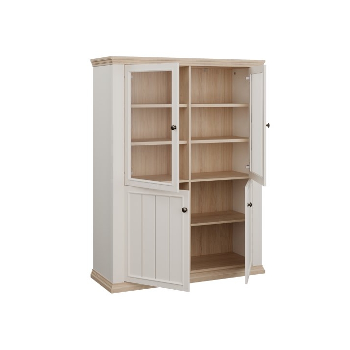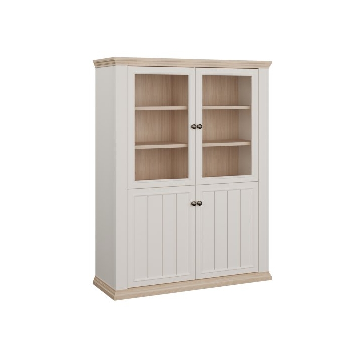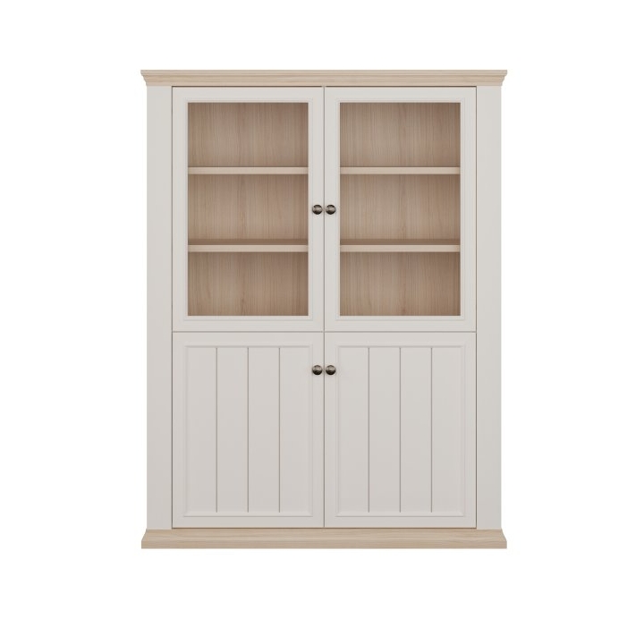 The interior is clearly divided into a display section and a storage section. The upper part features double glazed doors, behind which there are six shelves, ideal for displaying tableware, glassware, or decorative items. The lower section consists of closed cabinets with solid fronts, concealing two spacious shelves designed for larger items.