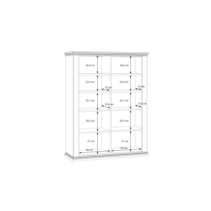 The Pontypool display cabinet is a spacious piece of furniture designed for the living room or dining area. It measures 199 cm in width, 156.2 cm in height, and 43.5 cm in depth. The construction is based on a chipboard carcass, with fronts made from MDF and tempered glass.