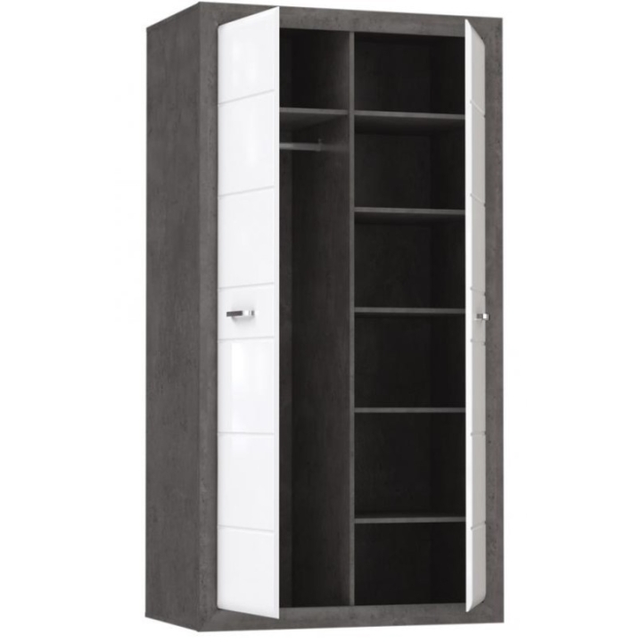 Lennox New wardrobe from the Lennox collection by Forte is a graceful piece of functional use, especially in small hallways, youth bedrooms, as well as other rooms where there is a need to organise a simple wardrobe. Minimalistically milled fronts, finished in high gloss, beautifully contrast with the body of the wardrobe in dark grey concrete. The interior of the wardrobe allows you to optimally organise your clothes. The right side features a vertical section of packed shelves, while the left side offers a classic hanger rail. Glossy handles fixed symmetrically in the central part of the fronts emphasise the modernist character of the Lennox New collection from the manufacturer Forte.