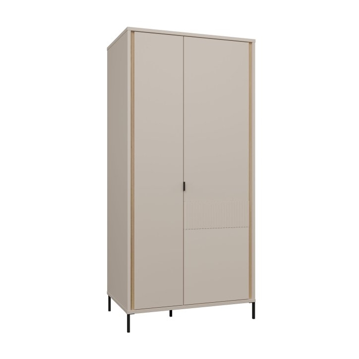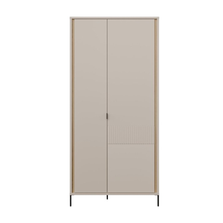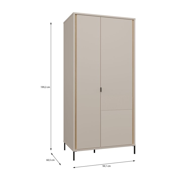 The Seravel wardrobe, measuring 94.1 cm in width, 199.2 cm in height, and 60.5 cm in depth, combines a soft cashmere finish with a Mauvella oak body, creating a balanced and modern look. It stands on black metal legs, which add subtle contrast and make it easier to keep the space underneath clean.