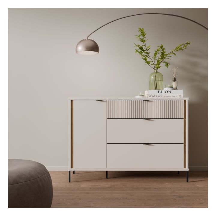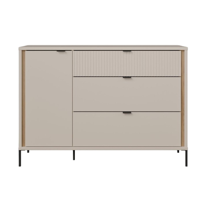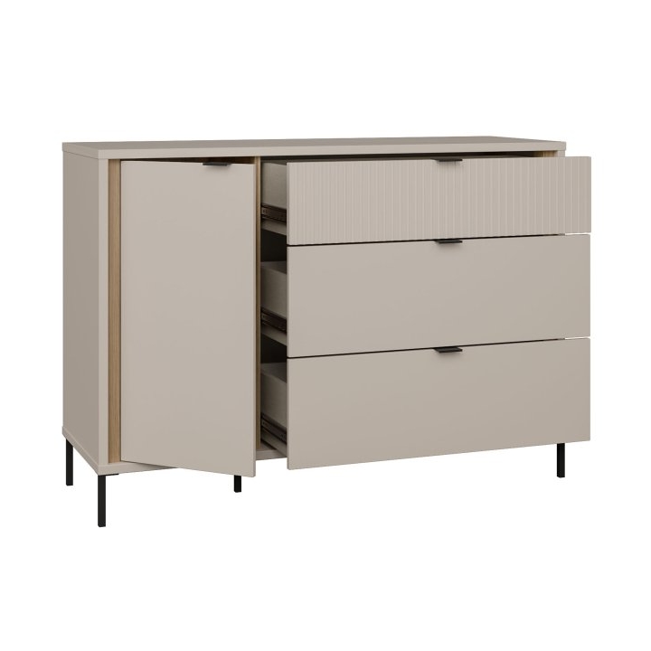 The Seravel sideboard, measuring 124.1 cm in width, 87.2 cm in height, and 41.5 cm in depth, combines cashmere fronts with a Mauvella oak body, creating a warm and balanced look. It is supported by tall black metal legs, which add contrast and enhance the visual lightness of the piece.