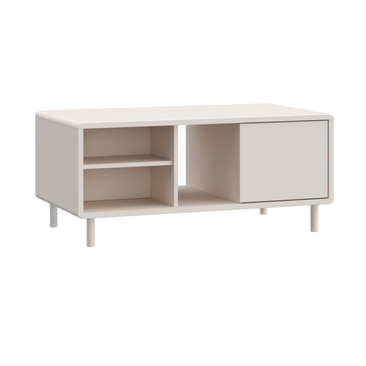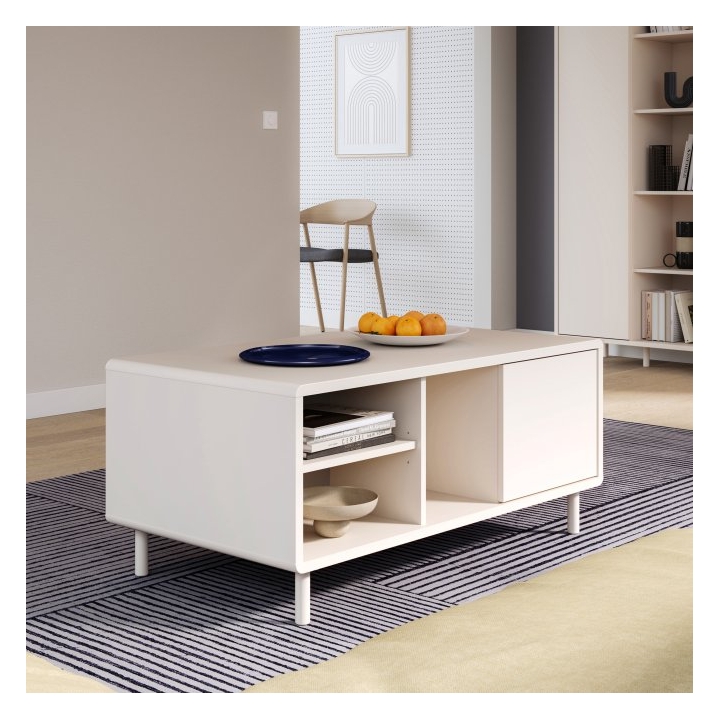 The Playly coffee table, measuring 110 cm in width, 48.6 cm in height, and 60 cm in depth, stands out with its uniform cashmere colour, giving the piece a light and elegant appearance.