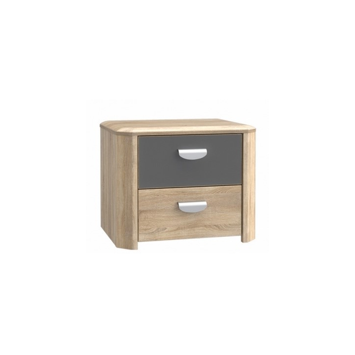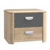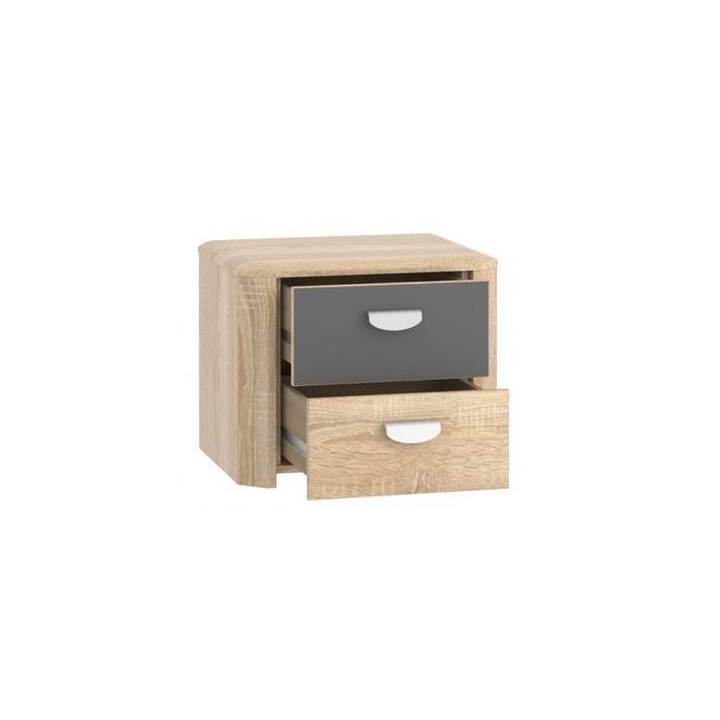 The bedside cabinet from the Yoop collection from furniture manufacturer Forte is a light and modern proposal, ideal for a youth room. The nightstand with two practical drawers is a must-have for any bedroom. Say goodbye to clutter next to the bed, because from now on you can arrange books, small electronics and personal items in the Yoop nightstand. Place a bedside lamp on the tabletop and store handy items you use before bed in the drawers, which are closed with ergonomic aluminium-coloured handles. The classic shape of the small cube, the two smooth drawer fronts in matt grey and light oak and the strikingly rounded edges make the nightstand model YPK02 Yoop from Forte aesthetically pleasing, stylish and modern.