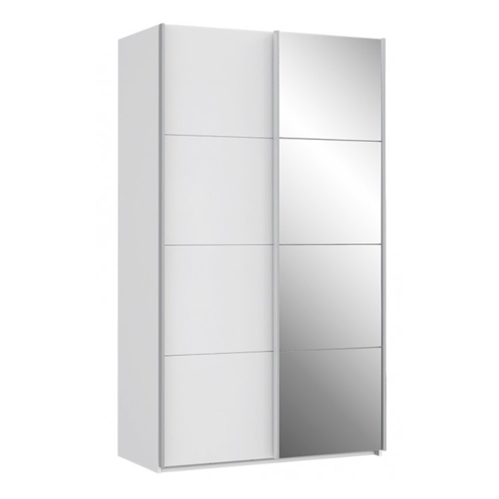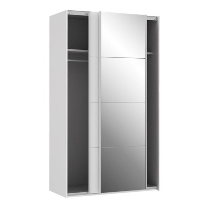 Wardrobe SPRS42412 from Sapporo collection by Forteequipped with a pair of sliding doors will delight you with its capacious interior. The front features a large mirror, which optically enlarges your space, which will certainly come in handy in small flats and will allow you to carefully check your appearance just before going out. The interior of the wardrobe has been carefully thought out, as it contains functional storage space for your entire wardrobe. It is divided into two niches, in each of which you will find a bar for hangers and one shelf. The wardrobe will work well both in the bedroom and in the hallway. The furniture is made of furniture board covered with foil, which guarantees durability and makes it easy to keep clean. The doors are decorated with elegant silver handles. The wardrobe in classic white will brighten up the room. In addition, the solid is decorated with tasteful horizontal lines visible on the surface of the mirror and on the door.