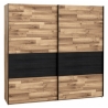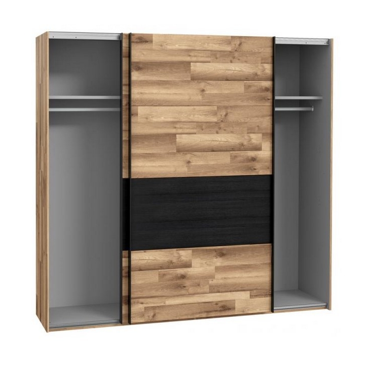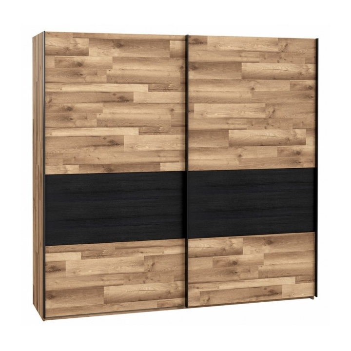 The two-door wardrobe Jakobina from the Forte manufacturer is a piece of furniture with a capacious interior, thus enabling you to keep your room tidy. The wardrobe has 2 sliding doors. The interior of the furniture is divided into two parts, each of which is equipped with a hanger rail and a shelf. Such a structure makes it easy to arrange shoe boxes, everyday clothes or deal with elegant outfits which need to be kept on hangers. The colouring combining stave oak with black accents fits perfectly into the atmosphere of an elegant and modern bedroom. The high quality of workmanship is due to the durable furniture board. The Jakobina wardrobe will sensationally complement the arrangement of a bedroom, a spacious living room or a youth room.