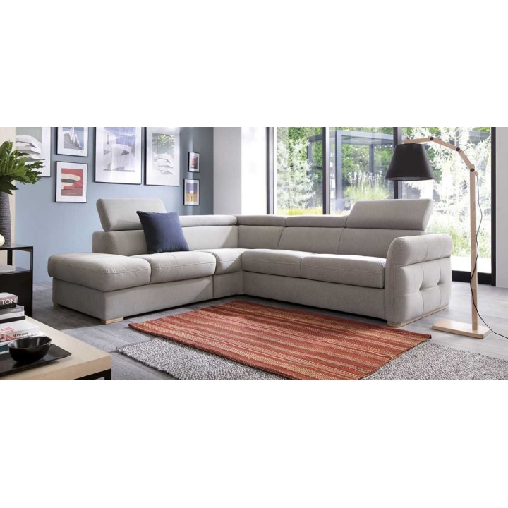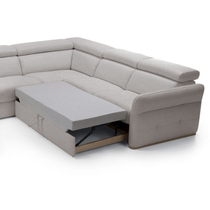 The Massimo corner sofa is set on 3 cm high wooden legs, which are available in a wide range of colours, from classic wood shades to modern colours. The filling of the seat with corrugated springs and high-flexible foam ensures durability and comfort, ideal for both everyday relaxation and occasional sleeping. The back of the corner sofa is filled with high resilience foam set on elastic bands, providing excellent support and comfort.