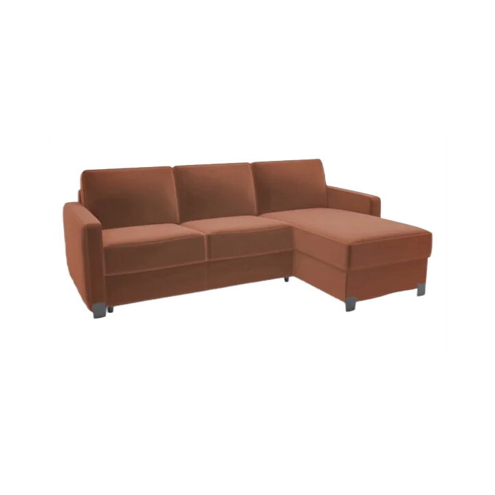 Black metal legs emphasise the modern character of the piece of furniture, while the use of an Italian frame with wooden slats allows for quick and easy unfolding of the corner sofa. The furniture also has a spacious storage compartment for bedding, which increases its functionality and allows you to keep your living room tidy. The seat has been fitted with high elastic foam and corrugated springs, which guarantees comfort during everyday use, while the backrest made of top elastic material supports proper body posture.