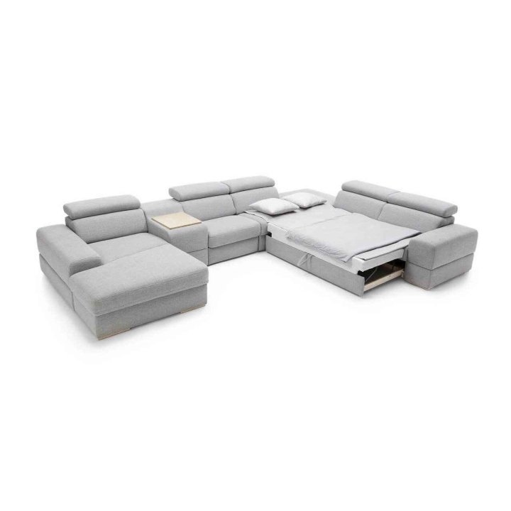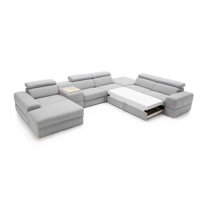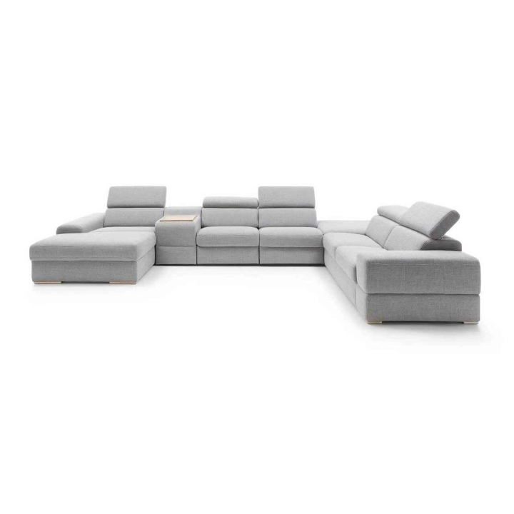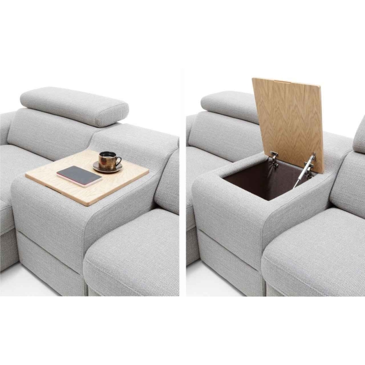 The Plaza 1DF-BARPROŚC-1(80)TVBBe-1(80)BB-DOST(E)-3QF corner sofa by Gala Collezione is a modular lounge furniture that combines modern design with many solutions. With a sleeping function and a bedding container, the corner sofa is an ideal choice for both everyday use and overnight stays for guests. The armchair with electric relaxation function allows the seating position to be adjusted to individual preferences, offering full comfort. The adjustable headrests allow you to fine-tune the backrest for greater comfort.
