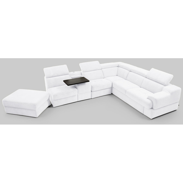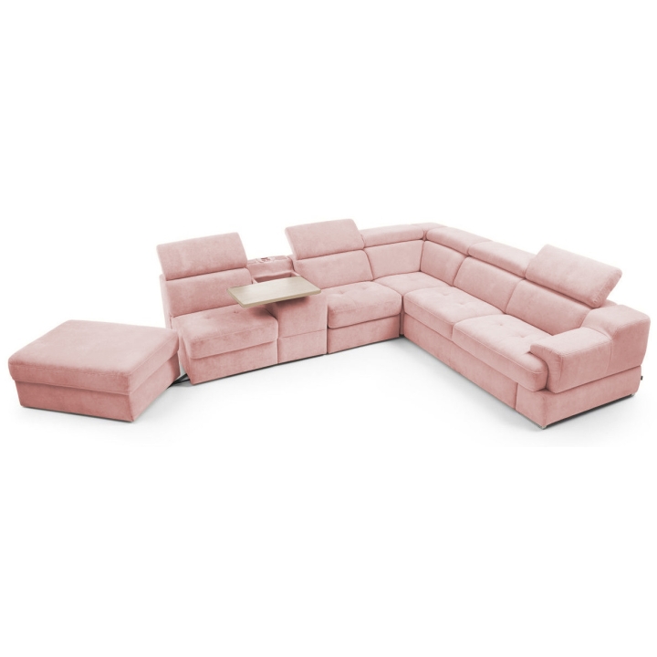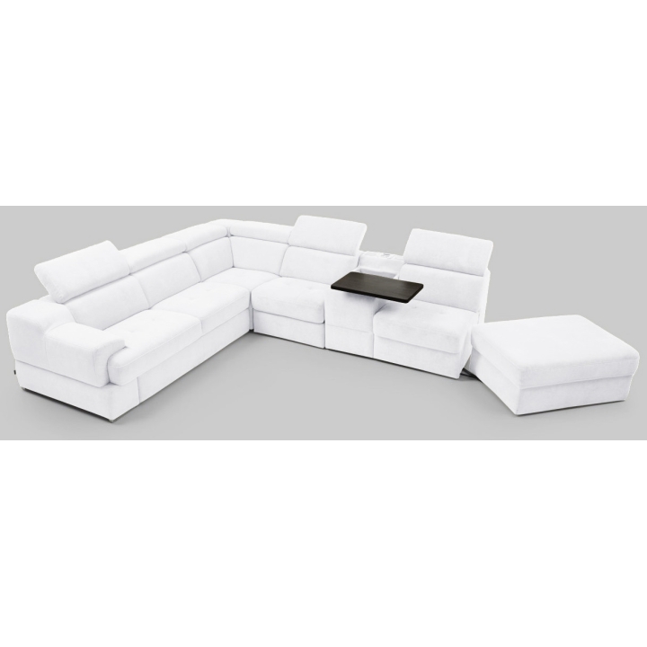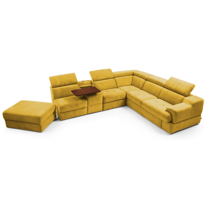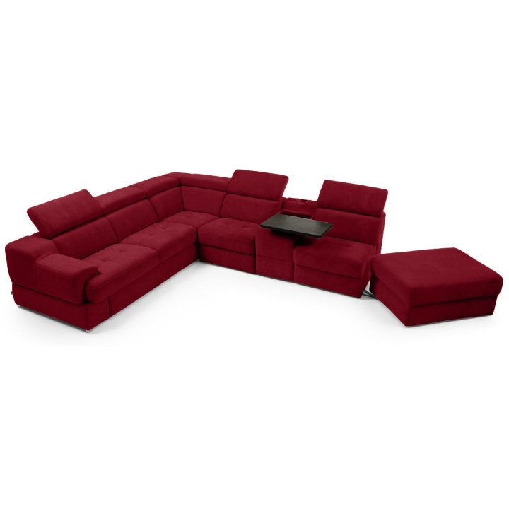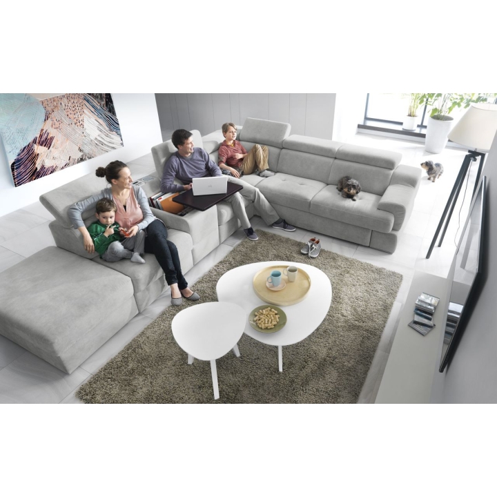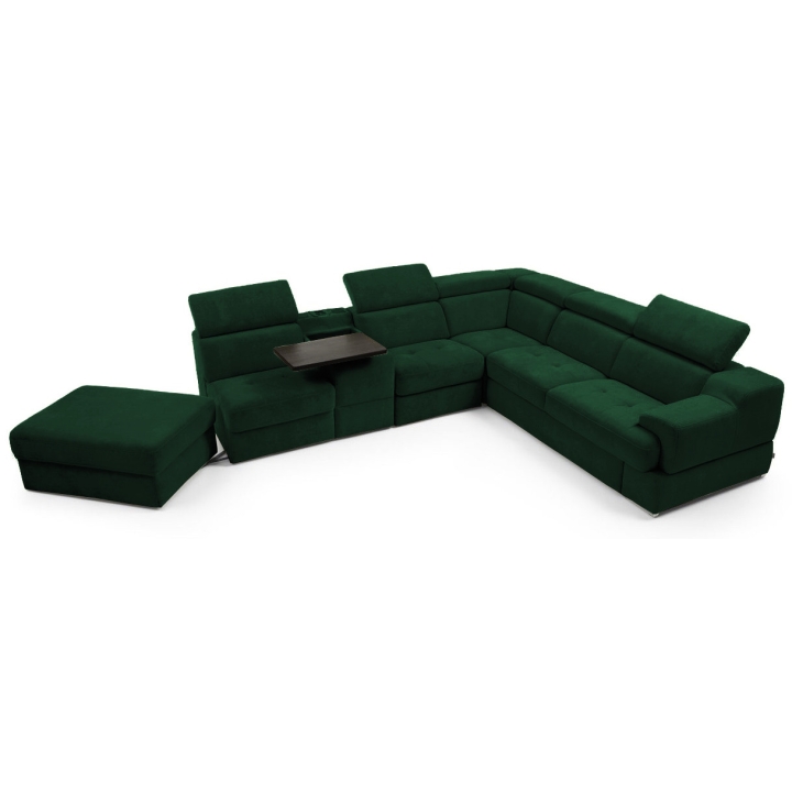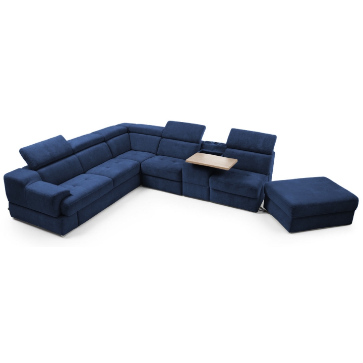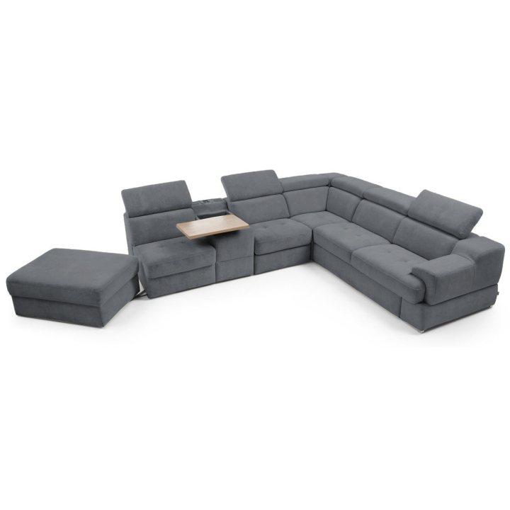 The seat made of high-flexible foam on corrugated springs and the backrest made of polyurethane foam on elastic bands ensure a high comfort of rest. The movable extension with storage increases the usability of the corner sofa, and the electric relaxation function allows for complete relaxation. The quilted seat, adjustable headrests and a choice of upholstery from a wide range of fabrics and natural leathers emphasise the modern character of the furniture.