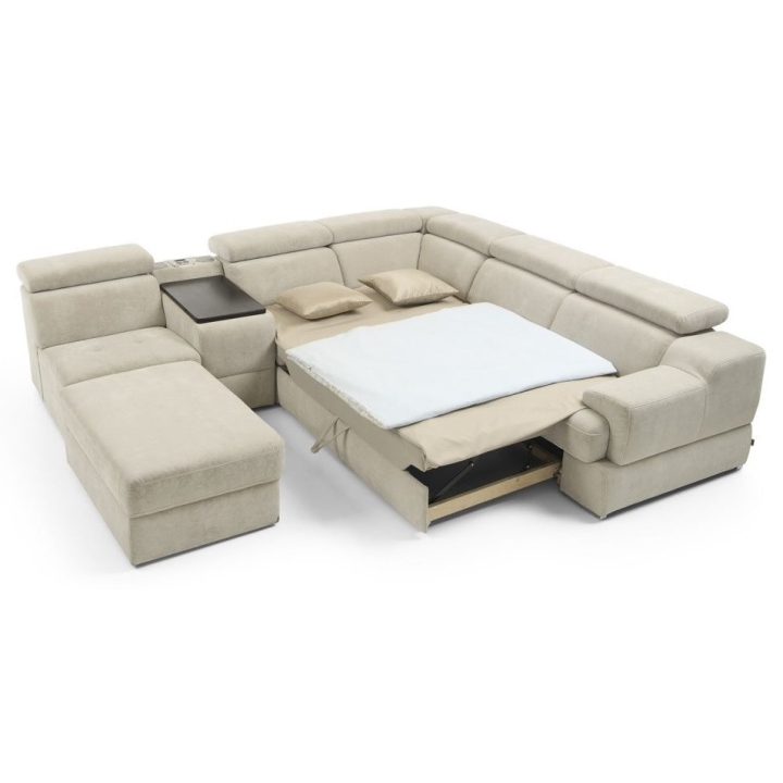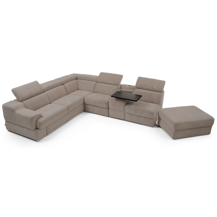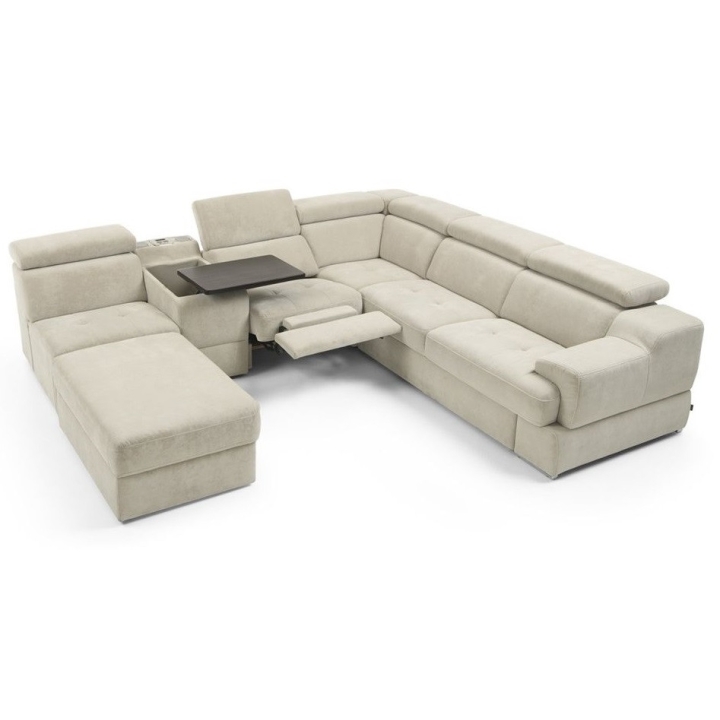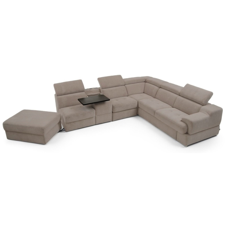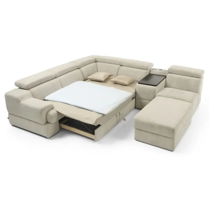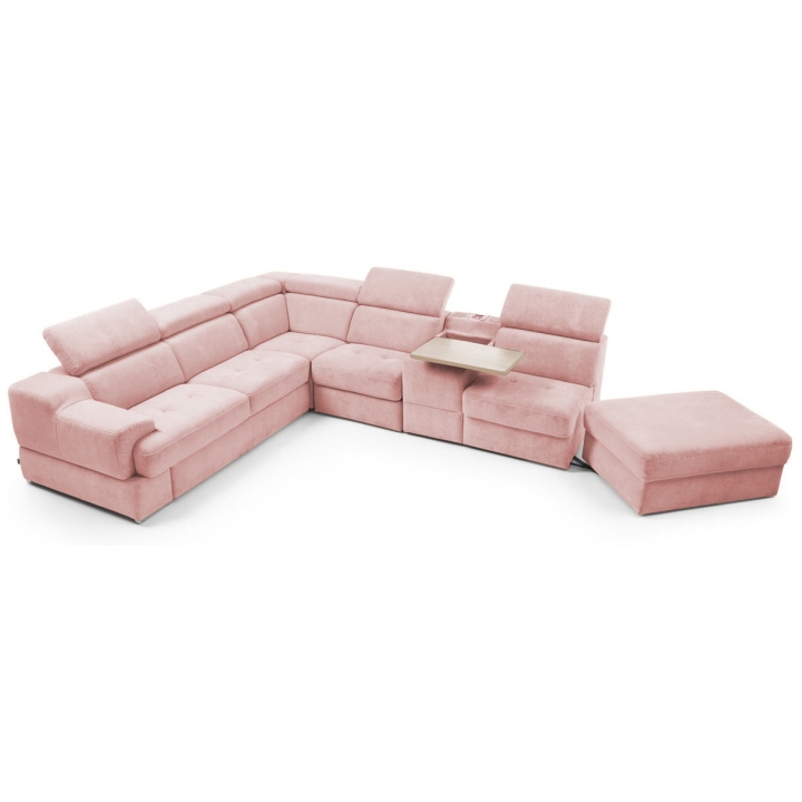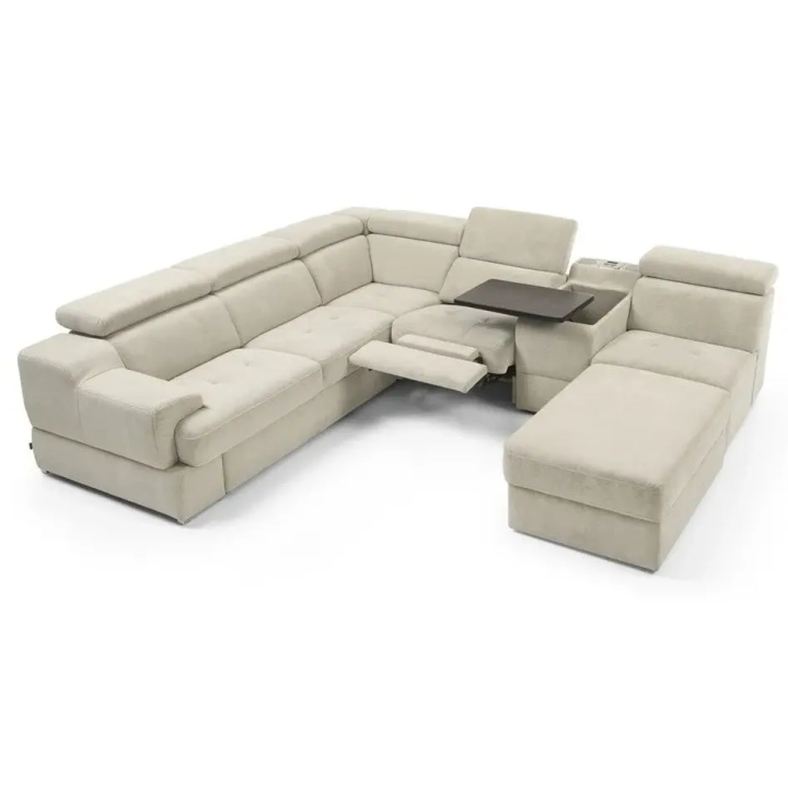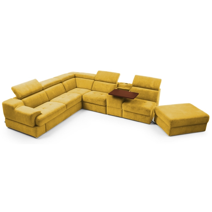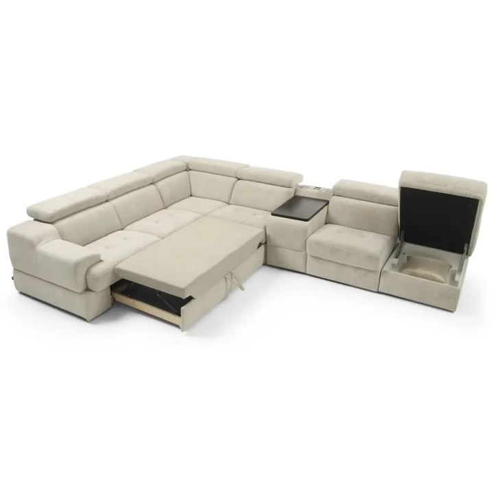 The seat made of high-flexible foam on corrugated springs and the backrest made of polyurethane foam on elastic bands ensure a high comfort of rest. The movable extension with storage increases the usability of the corner sofa, and the electric relaxation function allows for complete relaxation. The quilted seat, adjustable headrests and a choice of upholstery from a wide range of fabrics and natural leathers emphasise the modern character of the furniture.