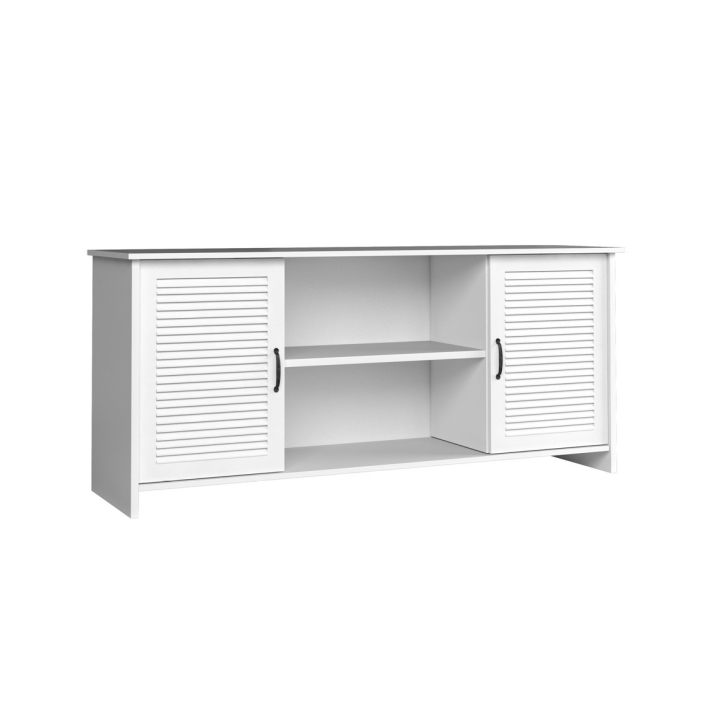 The Orient chest of drawers is a fucnjoanl piece of furniture that stands out both visually and in terms of quality. The chest of drawers consists of two capacious, lockable cabinets and two open shelves. The whole is topped off with a spacious top. The Orient K2D chest of drawers can definitely serve as a RTV cabinet. The charming atmosphere of this product is definitely the interesting grooved structure on the front, which creates an idyllic, cosy arrangement. The entire piece is coloured in matt white, introducing us to a rustic atmosphere. In addition, the light colouring helps to optically enlarge the interior. The universal and classic colour blends well with any colour or pattern. On the other hand, black metal handles add character.