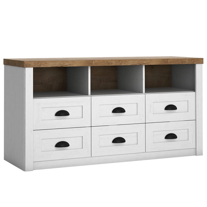 The Provence chest of drawers is a stylish piece of furniture with up to six capacious drawers. It also has three recesses. The whole is topped with a spacious, thickened top. The structure of the furniture was made of high quality materials in the form of laminated board. Due to its beautiful finishes and attractive handles, it is becoming an inseparable part of high quality interiors where Provencal climate reigns. The Provencal form in the warm colours of Andersen pine/ oak lefkas will change the interior, brighten it up and add an elegant character. The ornamental front is also eye-catching, enriching the whole and standing out from the rest of the interior furnishings.