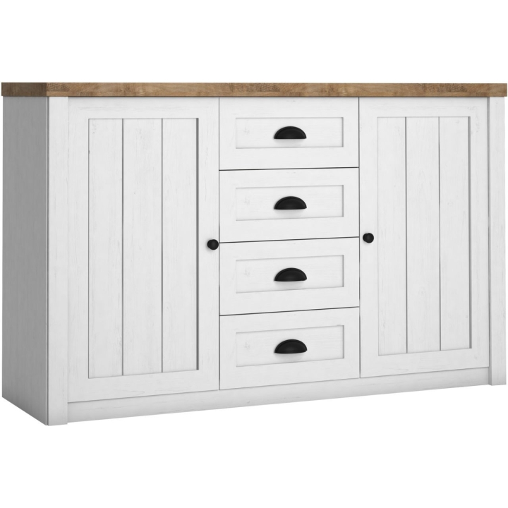 The chest of drawers from the Provence collection is a stylish piece of furniture that is sure to captivate all lovers of the climate of the south-eastern part of France, where idyllic atmosphere in the interiors intertwines with romantic, stylish accents. The chest of drawers is equipped with four capacious drawers and two closed cabinets with shelves. The elegant style and light, subtle colours are sure to bring a special glow to the interior. The form in a warm colour scheme of andersen pine/ oak lefkas will transform the interior, brighten it up and add an elegant character. The structure of the furniture was made from high quality materials in the form of laminated board, which is characterised by durability and resistance to any damage. The solid, thickened top and metal, black handles also look great.