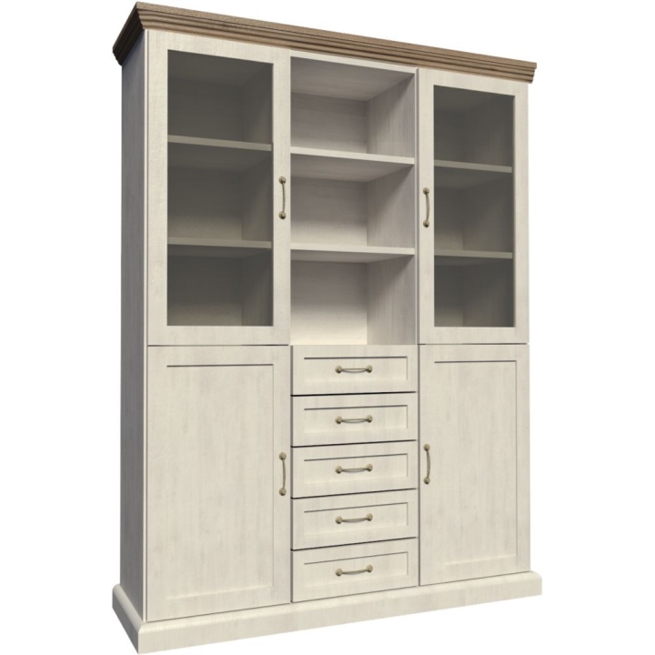 The Royal showcase delights not only with its large storage space, but also with its stylish design, reminiscent of the English style. The furniture is equipped with two glazed cabinets, practical shelves and five deep drawers. This design allows both the display of elegant crystals, porcelain or decorations and the arrangement of tableware, among others. The colour scheme in shades of white and grey combined with brushed wood and wild oak motifs is also beautiful, which will emphasise the classic and stylish aspect of the interior. The Royal vitrine is ideal for those who want an atmospheric atmosphere and harmonious soothing colours in their homes.