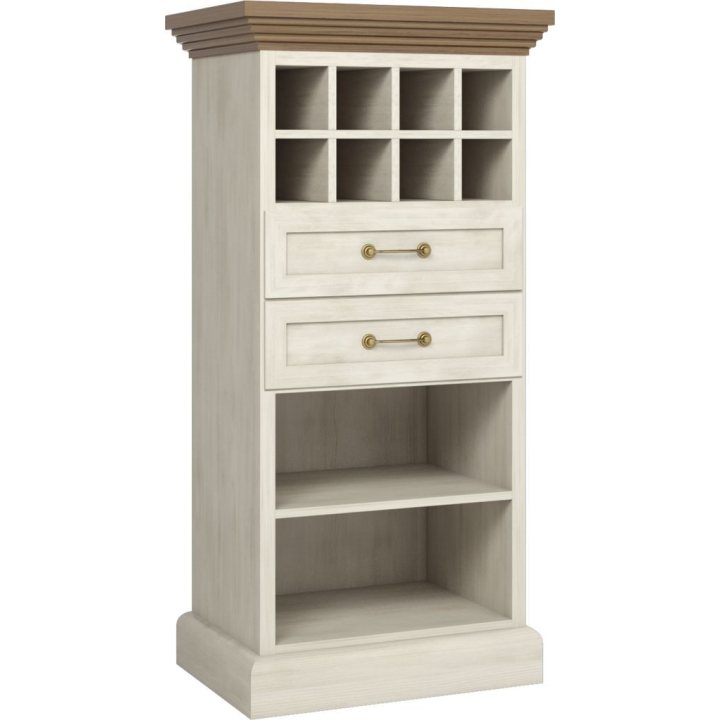 The Royal R2S book case from the manufacturer Gała Meble is a proposition for people who want their homes to have an atmospheric atmosphere and harmonious, soothing colours. The presented model is not only an elegant design, but also a very functional piece of furniture. It is equipped with two niches, two drawers and shelves for bottles. Such a structure will certainly enable you to keep many items and accessories in order and tidy. The Royal bookcase has been designed to accommodate as much as possible. Made of high quality laminated furniture board, it guarantees the solid's resistance to scratches and sunlight. The bookcase will successfully blend into both the dining room, living room and even the guest room.