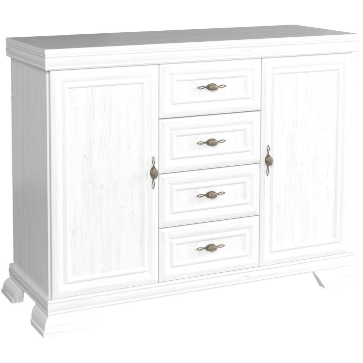 The Kora chest of drawers is an elegant piece of furniture for the living room, bedroom or hallway. The presented model is created for lovers of the classic style. Equipped with two capacious cabinets and drawers, it will help you keep order and tidiness in the room. It is worth noting that the piece of furniture looks natural due to the colour of wood in various options to choose from. The Kora chest of drawers, stained in Andersen pine, looks truly unique! The combination of symmetry and style balance will emphasise the gallant character of any arrangement. The commode's striking appearance is also due to the decorative grooves and tasteful handles.
