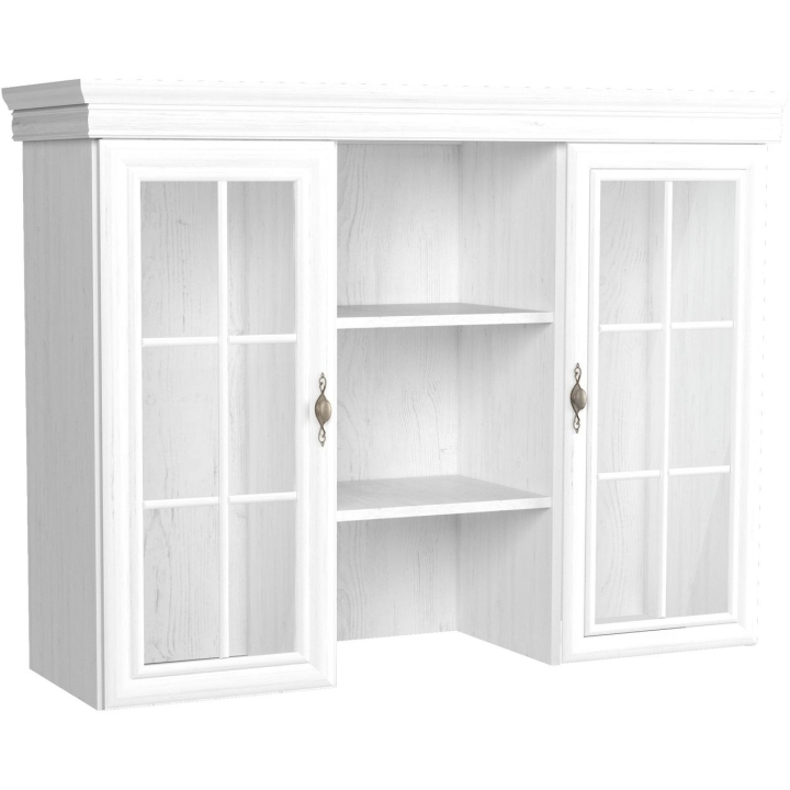 The Kora hanging extension consists of a two-door glazed section and three niches. Inside, there are two shelves behind the fronts. This model is combined with the Kora chest of drawers to form a practical display cabinet. The extension unit is made of high quality laminated board in the colour of Andersen pine. This classic piece of furniture from the collection has increased resistance to damage, moisture and high temperatures. It is sure to appeal to the refined tastes of all those who appreciate timeless beauty and classic elegance. Decorative fronts with matching handles, solid construction and tasteful finials are the hallmarks of the Kora extension.