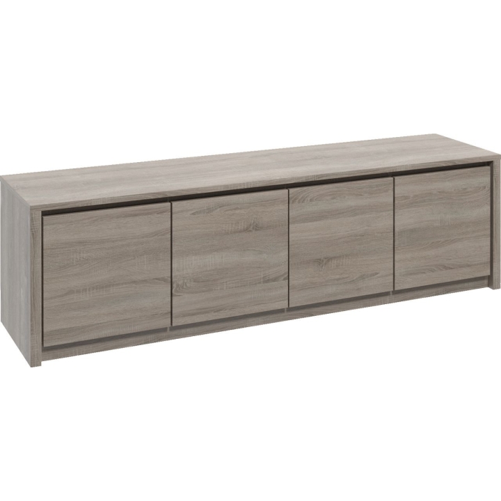 The low chest of drawers from the Montana collection is a practical piece of furniture equipped with practical cupboards - four, which will provide plenty of space to organise many things in them. Solid finishing of the body, mark the high quality of the product, maintaining its properties for many years of use. The chest of drawers is made of high quality laminated board in the colour of truffle oak. Truffle oak is a universal colour, which suits rooms of different styles. We can successfully combine it with walls in both light and dark colours. Its charm lies primarily in its simple form devoid of unnecessary protruding handles and in its striking colour scheme that alludes to the beauty of natural wood.
