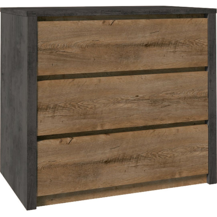 The chest of drawers from the Montanacollection is a practical piece of furniture. It will perfectly complement the interior of a bedroom, living room or hallway. The furniture is equipped with a soft-closing system, which not only makes no noise, but also reduces the force with which the drawer closes. Handleless fronts perfectly accent the contemporary character of the unit. The colouring of the furniture is also excellent. The chest of drawers in the colours of oak lefkas and smooth grey will find a perfect match in modern interiors as well as in classic interiors. The solid finishes of the body highlight the high quality of the product, maintaining its properties for many years of use. The chest of drawers is equipped with three capacious drawers, thanks to which you will be able to organise all your most necessary things.