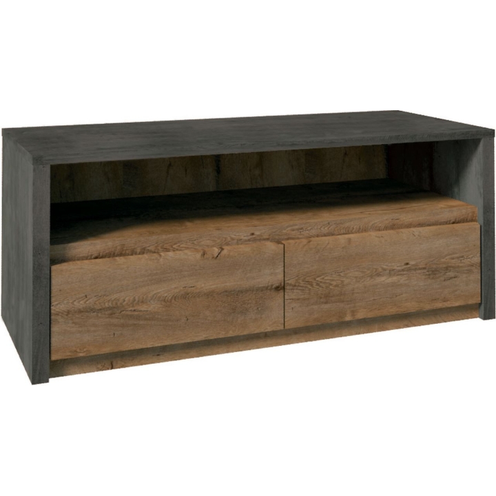 The RTV cabinet from the Montana collection has a modern look, plus it has practical drawers and niches that will allow you to store all your essential accessories. The RTV cabinet is also an excellent complement to the interior design. The stylish colouring in oak lefkas and smooth grey also draws attention. Thanks to this, the furniture will perfectly fit into a stylish living room or a modern youth room. The furniture is very functional, with a shelf and two capacious drawers for small items. The cabinet will provide space for a variety of electronic equipment, gadgets and documents. The unit is topped off with a spacious tabletop where you can place your TV and small decorations. The high quality of the furniture board resistant to mechanical damage makes the piece of furniture look very aesthetically pleasing even after many years.