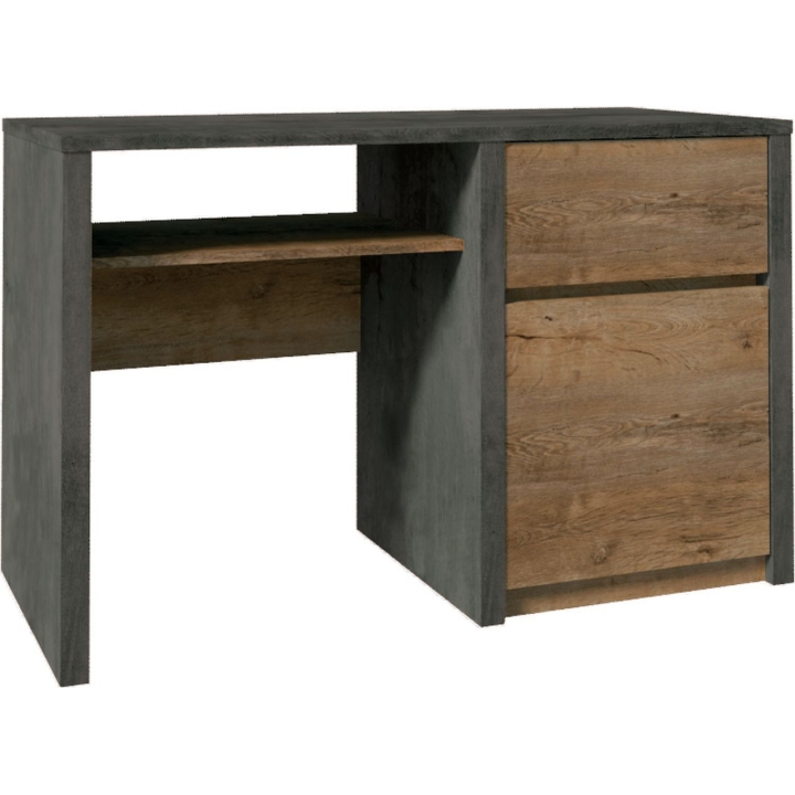The Montana desk is a modern piece of furniture with a simple, minimalist form and stylish colouring. The desk in the colour of oak lefkas and smooth grey fits perfectly into modern as well as classic interiors. It will warm up the interior and at the same time give it character. The massive finishes of the carcass mark the high quality of the product, maintaining its properties for many years of use. The furniture is equipped with a practical cupboard, a keyboard shelf and a capacious drawer. The spacious top will allow for effective work and study. It will be perfect in an office, home study or youth room. High quality workmanship made of furniture board, guarantees long-lasting use.
