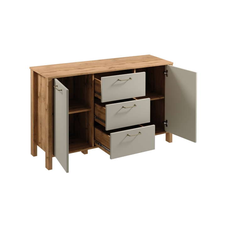 The Indygo K2D3S chest of drawers is equipped with three full-extension drawers, making it much easier to access stored items such as trinkets, documents or wardrobe items. Two capacious cabinets offer additional storage space, while the spacious top is the perfect place for decorations to complement your interior design.