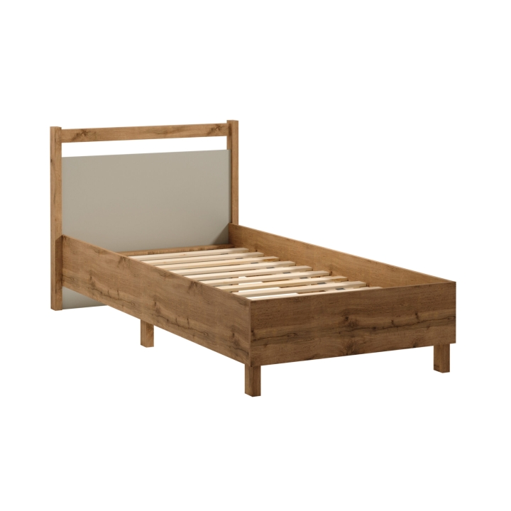 The design of the Indigo L90 bed combines the natural pine wood used for the frame and the harmonious combination of the Wotan Oak décor with the beige colour on top of the bed.