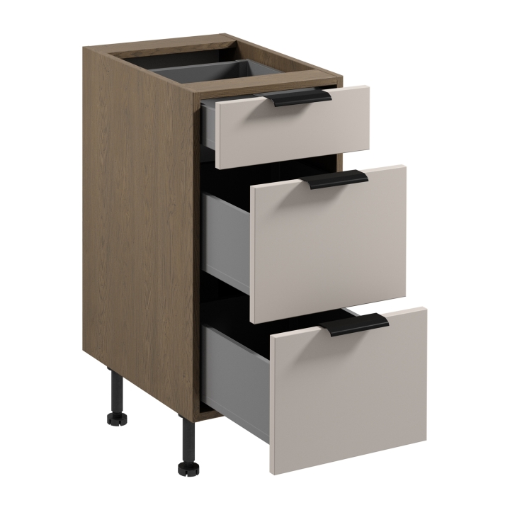The Sorento D40S3 P/L AX base cabinet is a 40 cm wide model with three independent drawers, allowing for orderly storage of kitchen equipment. The body of the furniture is made of 18 mm thick laminated board, showing high resistance to mechanical damage, which works well in conditions of intensive use.